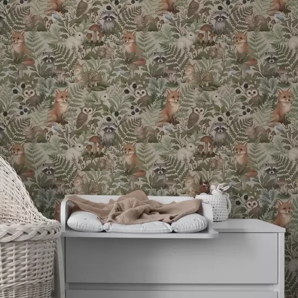 Papel de parede Animais da floresta, samambaias e cogumelos em bege claro Nr. a00880v1