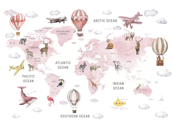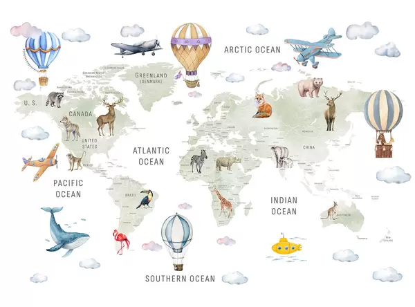 Murais de parede Mapa infantil em estilo aquarela com animais e balões de ar quente. Em inglês. Cor azul. Nr. c00001env1