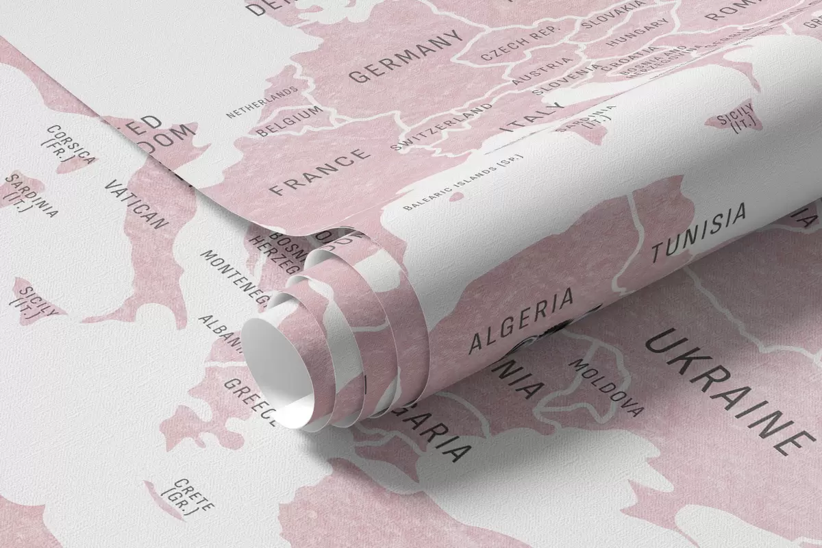 Murais de parede Mapa infantil em estilo aquarela com animais e balões de ar quente. Em inglês. Cor rosa. Nr. c00001env3