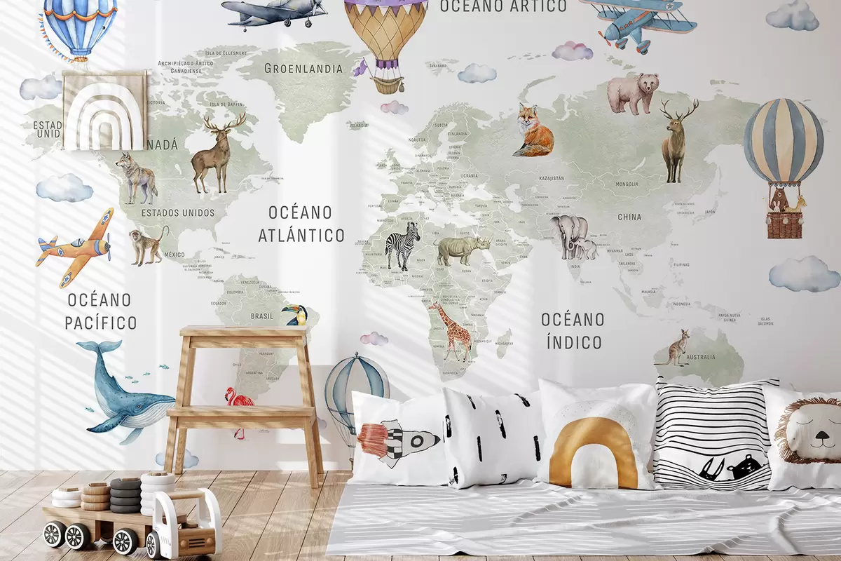Murais de parede Mapa infantil em estilo aquarela com animais e balões de ar quente. Em espanhol. Cor verde. Nr. c00001es