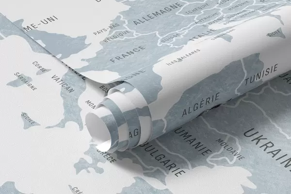Murais de parede Mapa infantil em estilo aquarela com animais e balões de ar quente. Em francês. Cor azul. Nr. c00001frv1