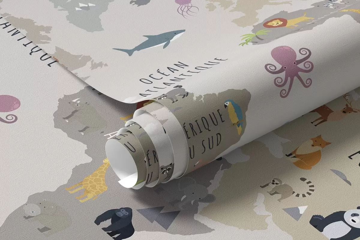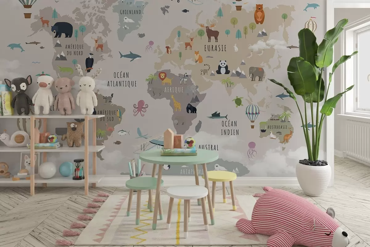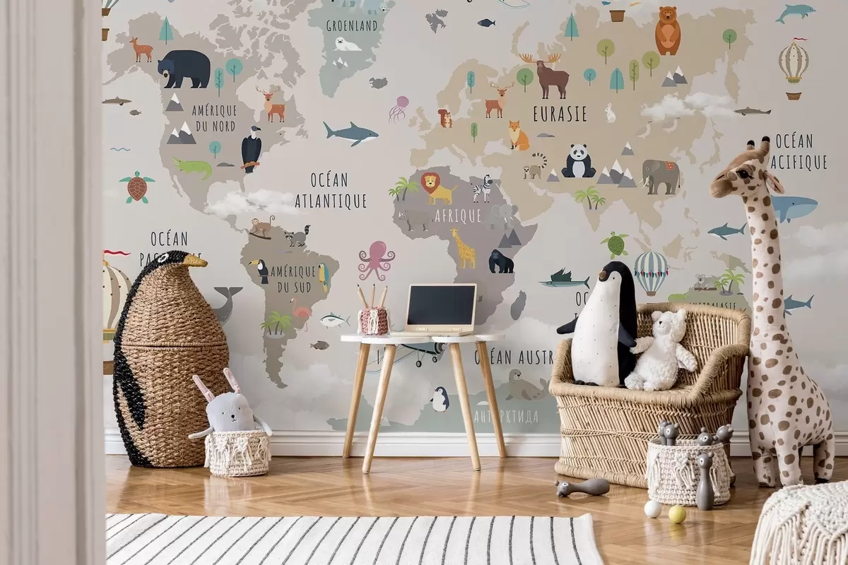 Murais de parede Mapa-múndi infantil com animais e balões de ar quente. Língua francesa Nr. c00002fr