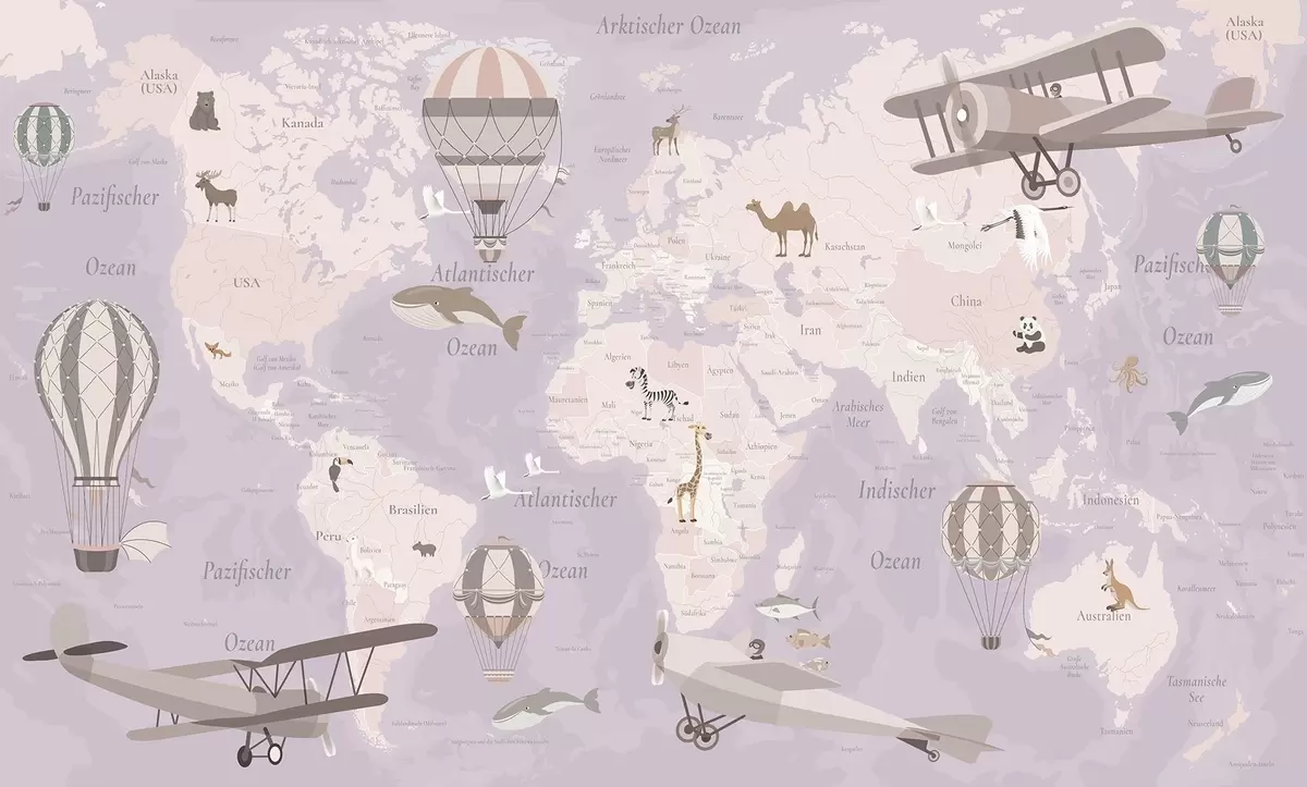 Murais de parede Mapa-múndi infantil com animais, aviões e balões de ar quente. Em alemão. Cor roxa. Nr. c00003dev4