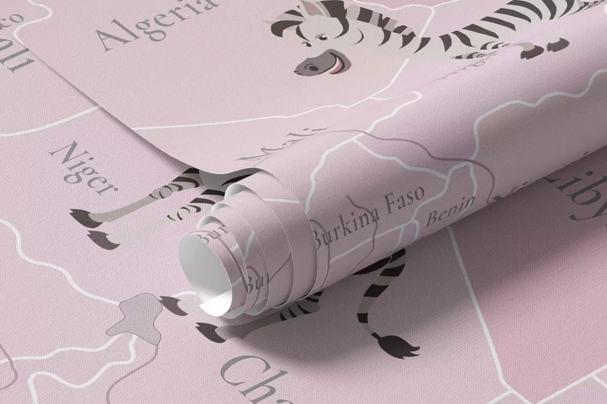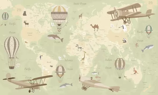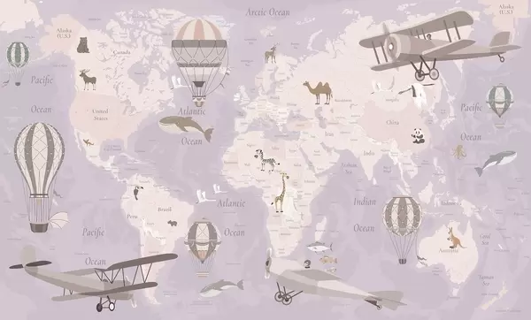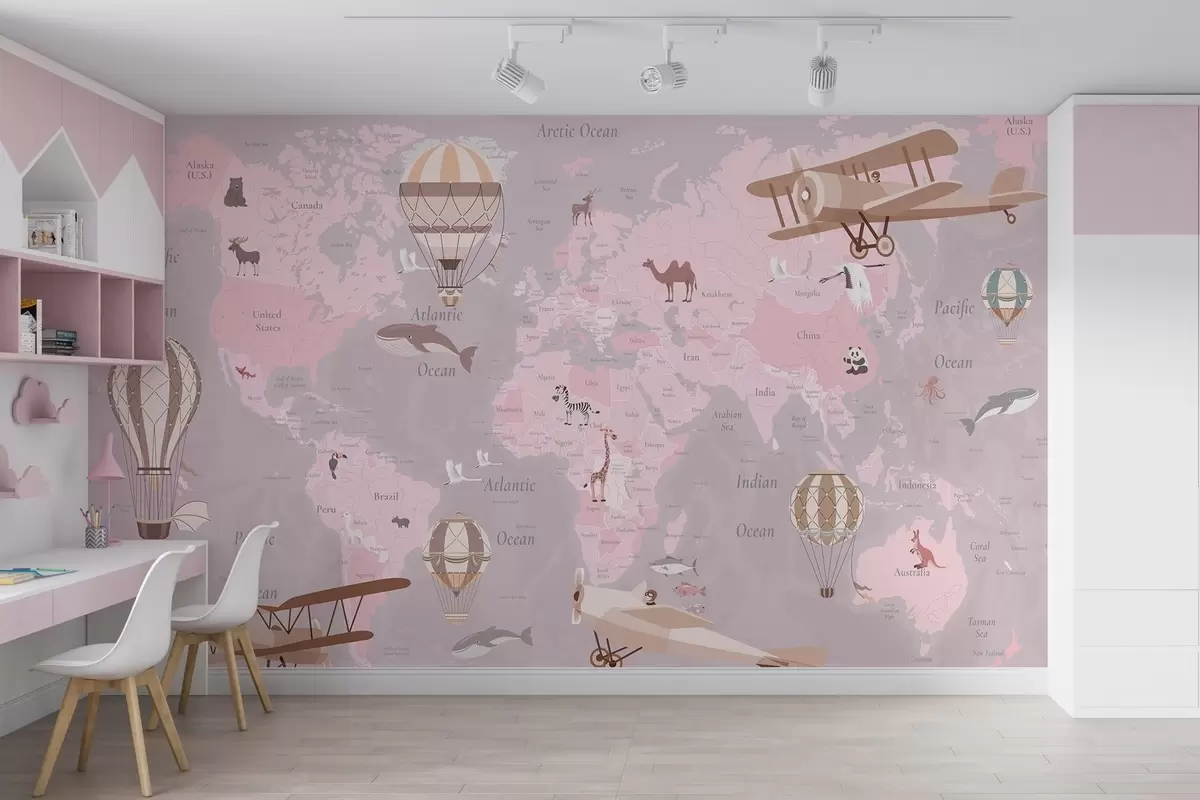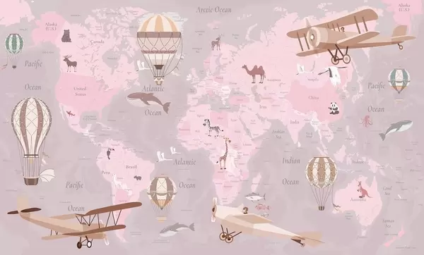Murais de parede Mapa-múndi infantil com animais, aviões e balões de ar quente. Em inglês. Cor rosa. Nr. c00003env3