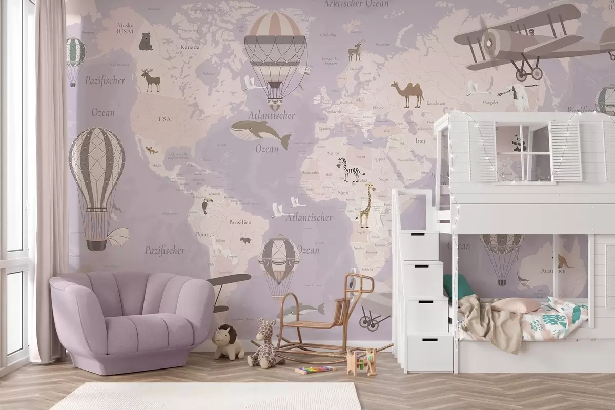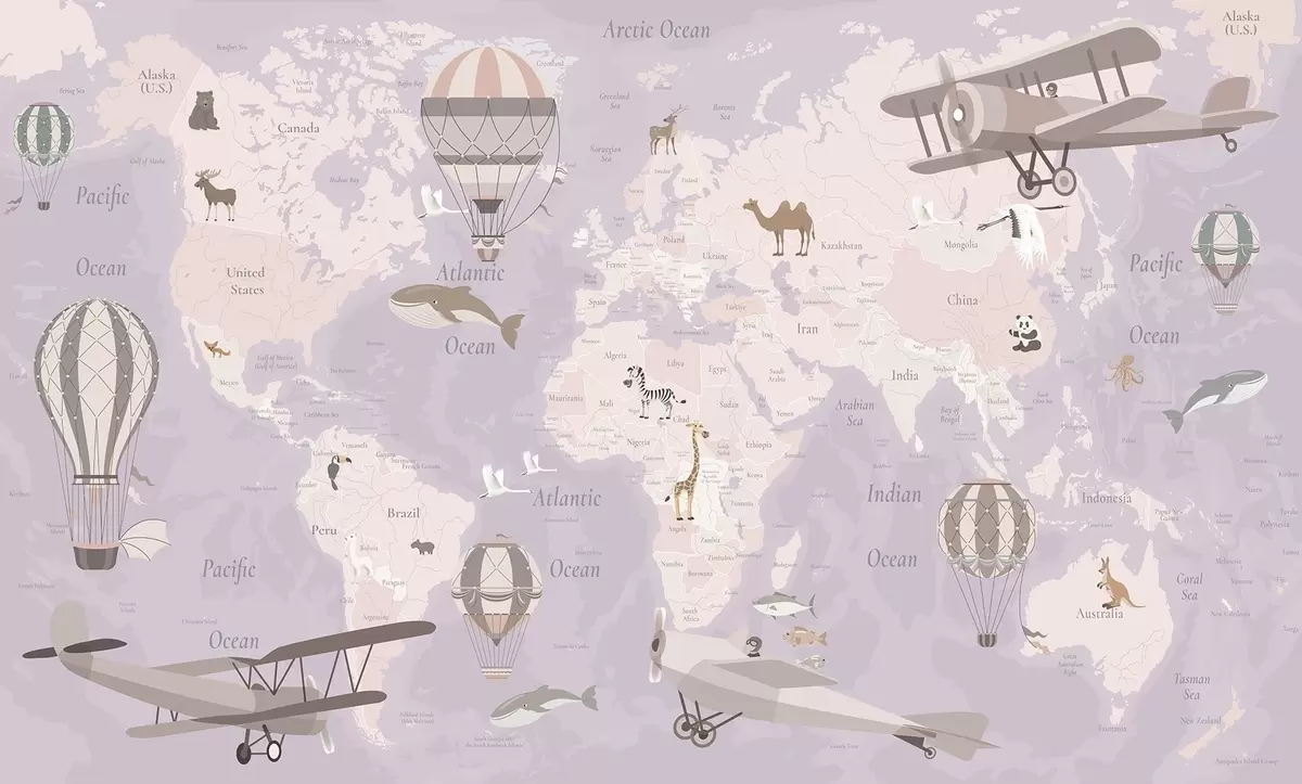 Murais de parede Mapa-múndi infantil com animais, aviões e balões de ar quente. Em inglês. Cor roxa. Nr. c00003env4