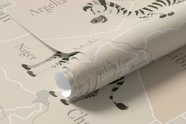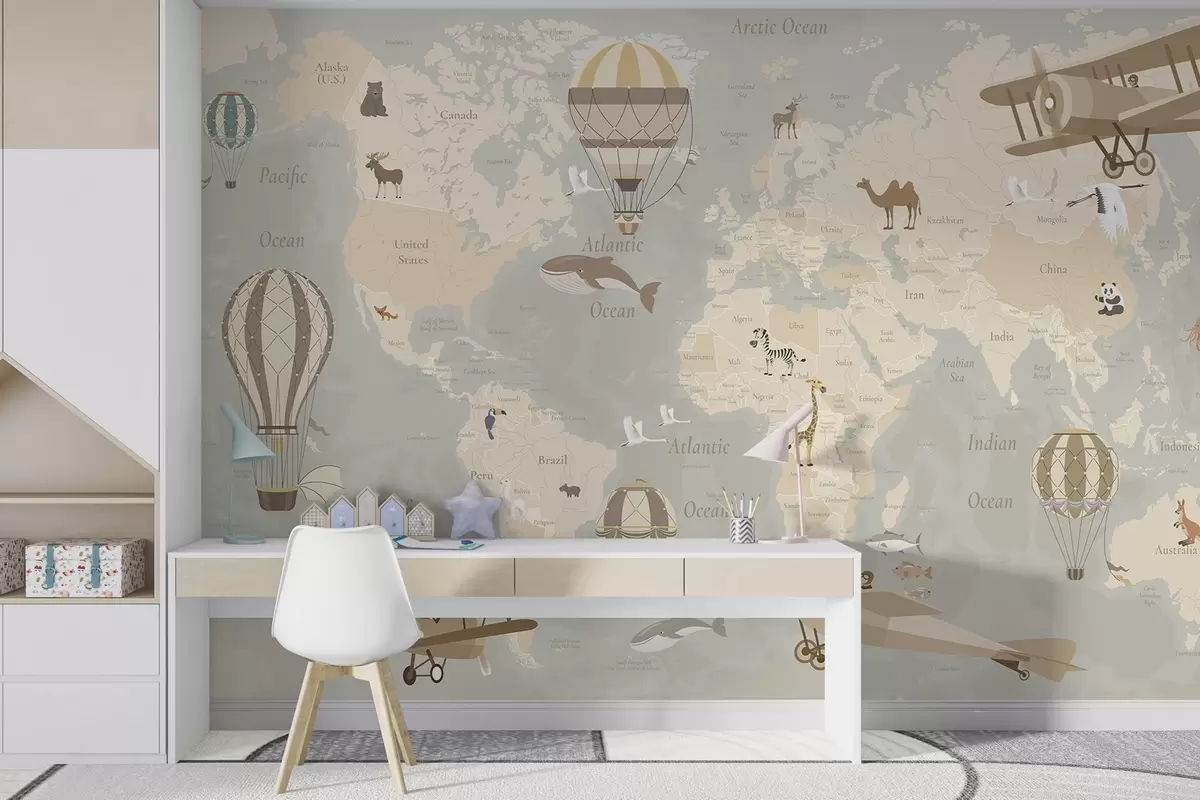 Murais de parede Mapa-múndi infantil com animais, aviões e balões de ar quente. Em espanhol. Cor bege Nr. c00003es