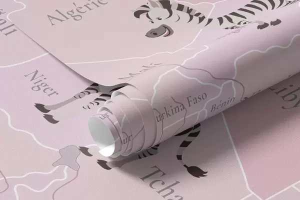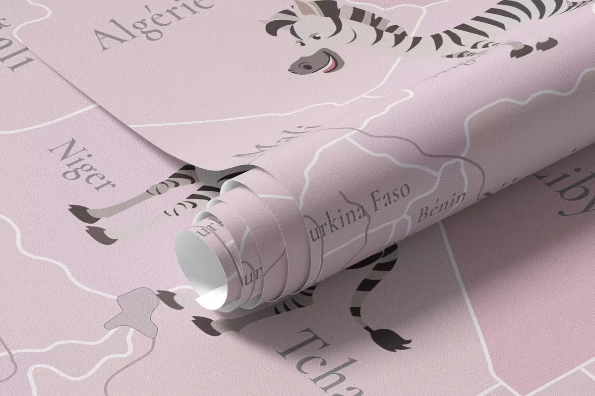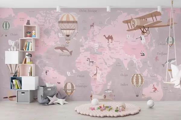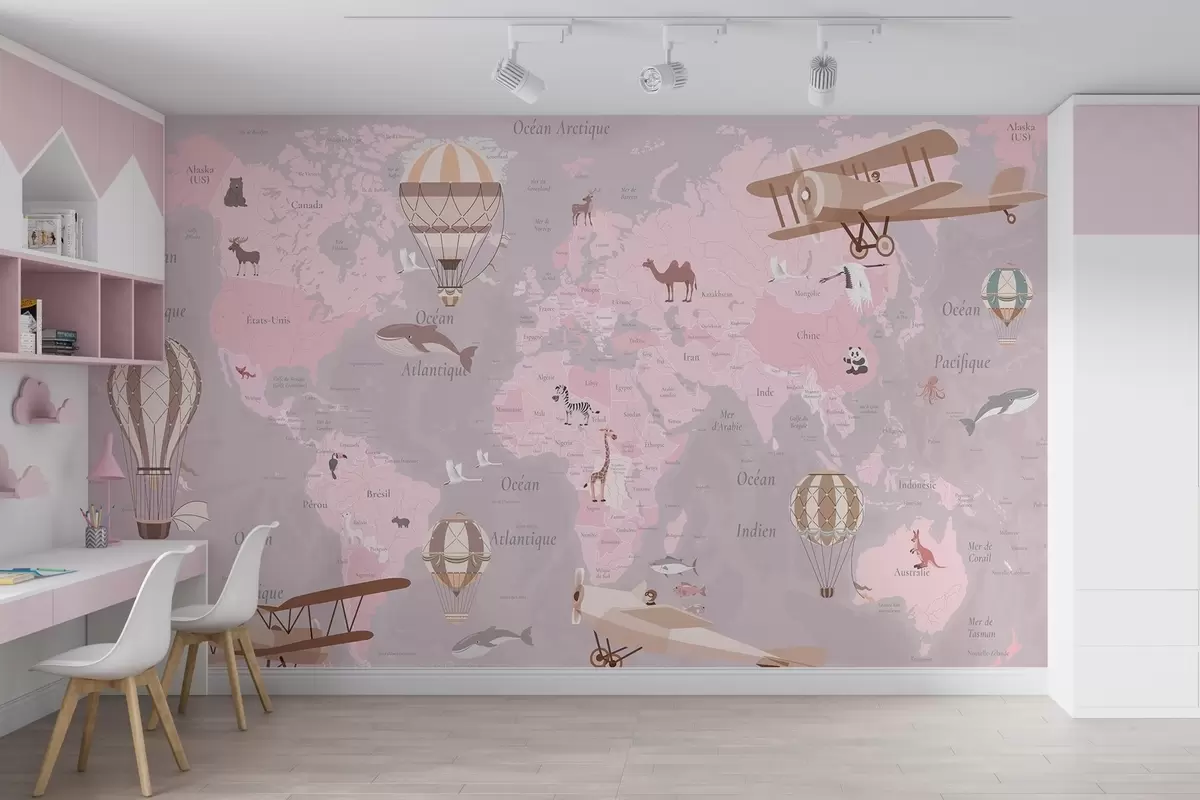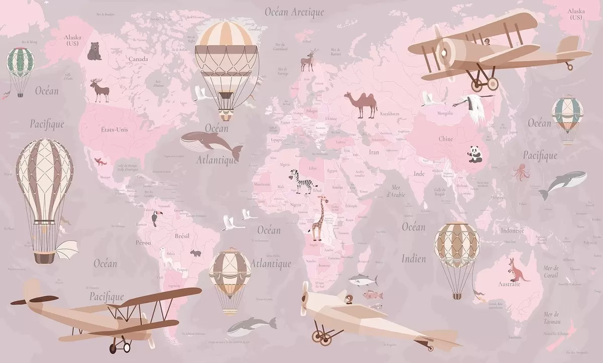 Murais de parede Mapa-múndi infantil com animais, aviões e balões de ar quente. Em francês. Cor rosa. Nr. c00003frv3