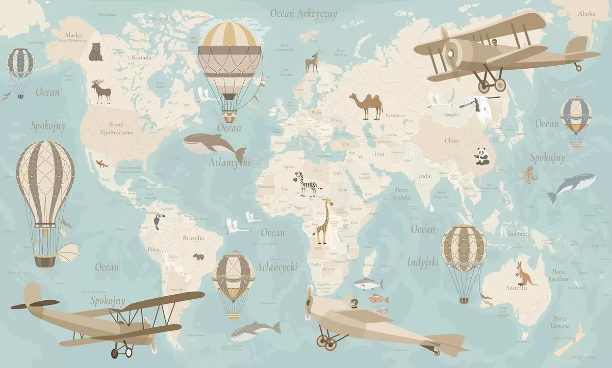 Murais de parede Mapa-múndi infantil com animais, aviões e balões de ar quente. Língua polonesa. Cor azul. Nr. c00003plv1