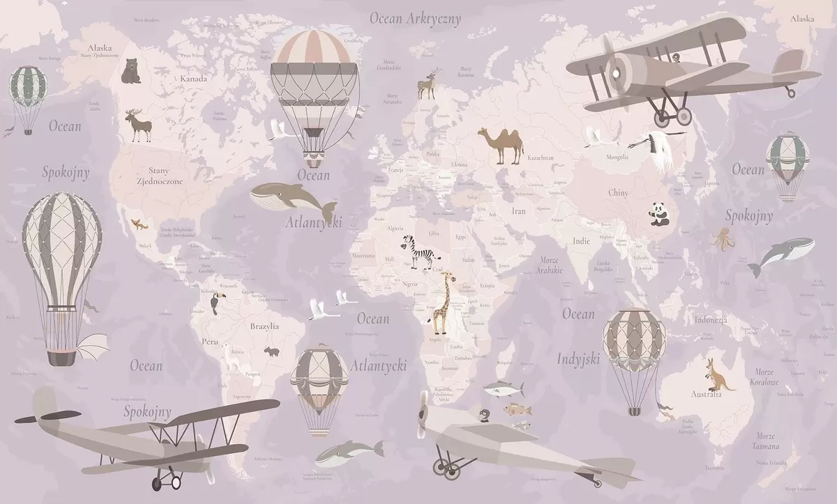 Murais de parede Mapa-múndi infantil com animais, aviões e balões de ar quente. Idioma polonês. Cor roxa. Nr. c00003plv4