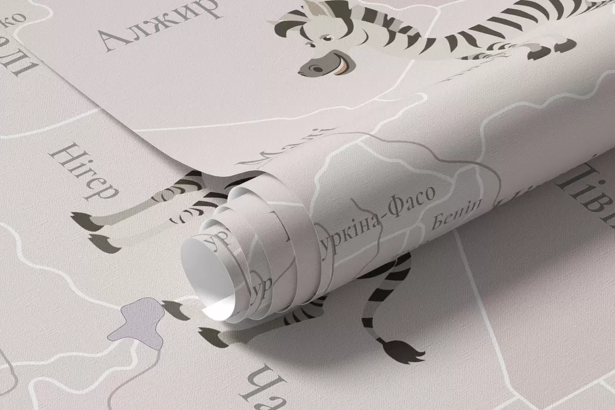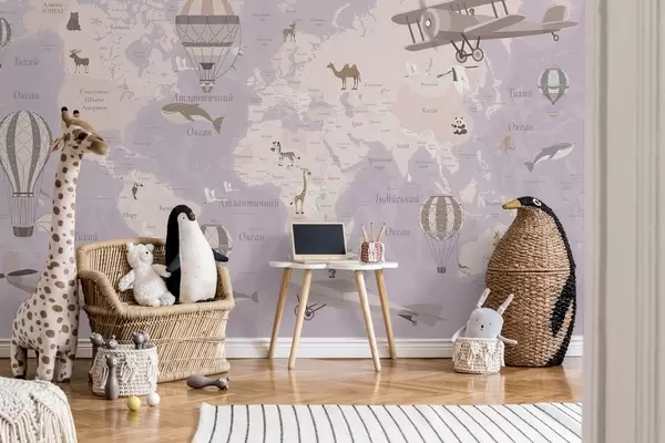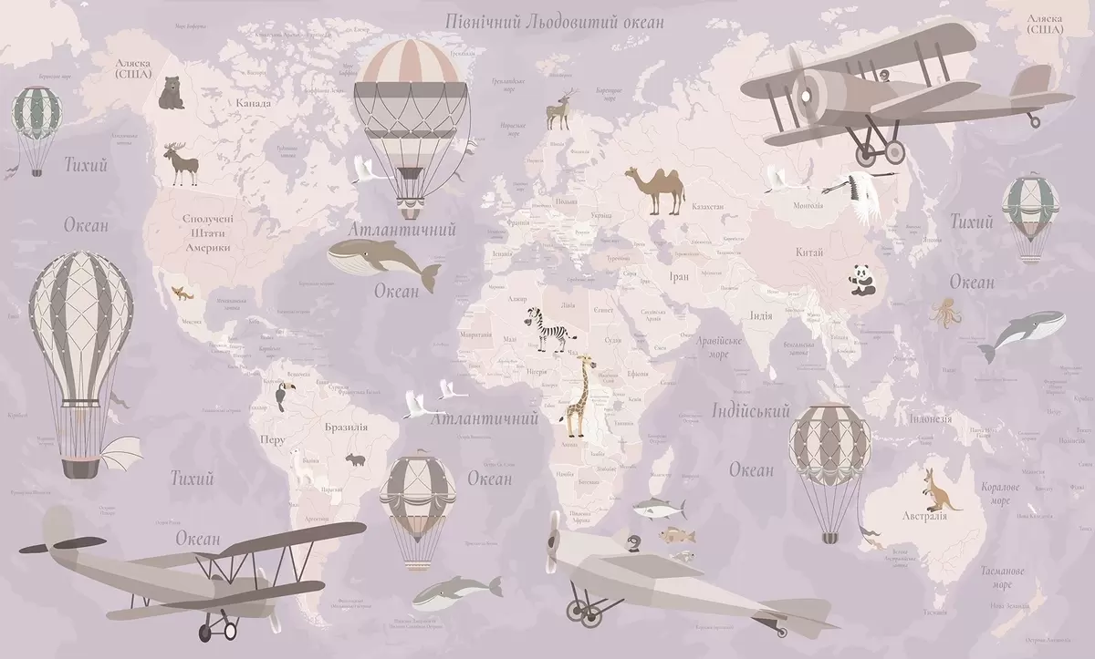 Murais de parede Mapa-múndi infantil com animais, aviões e balões de ar quente. Idioma ucraniano. Cor roxa. Nr. c00003ukv4