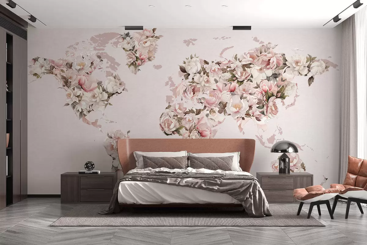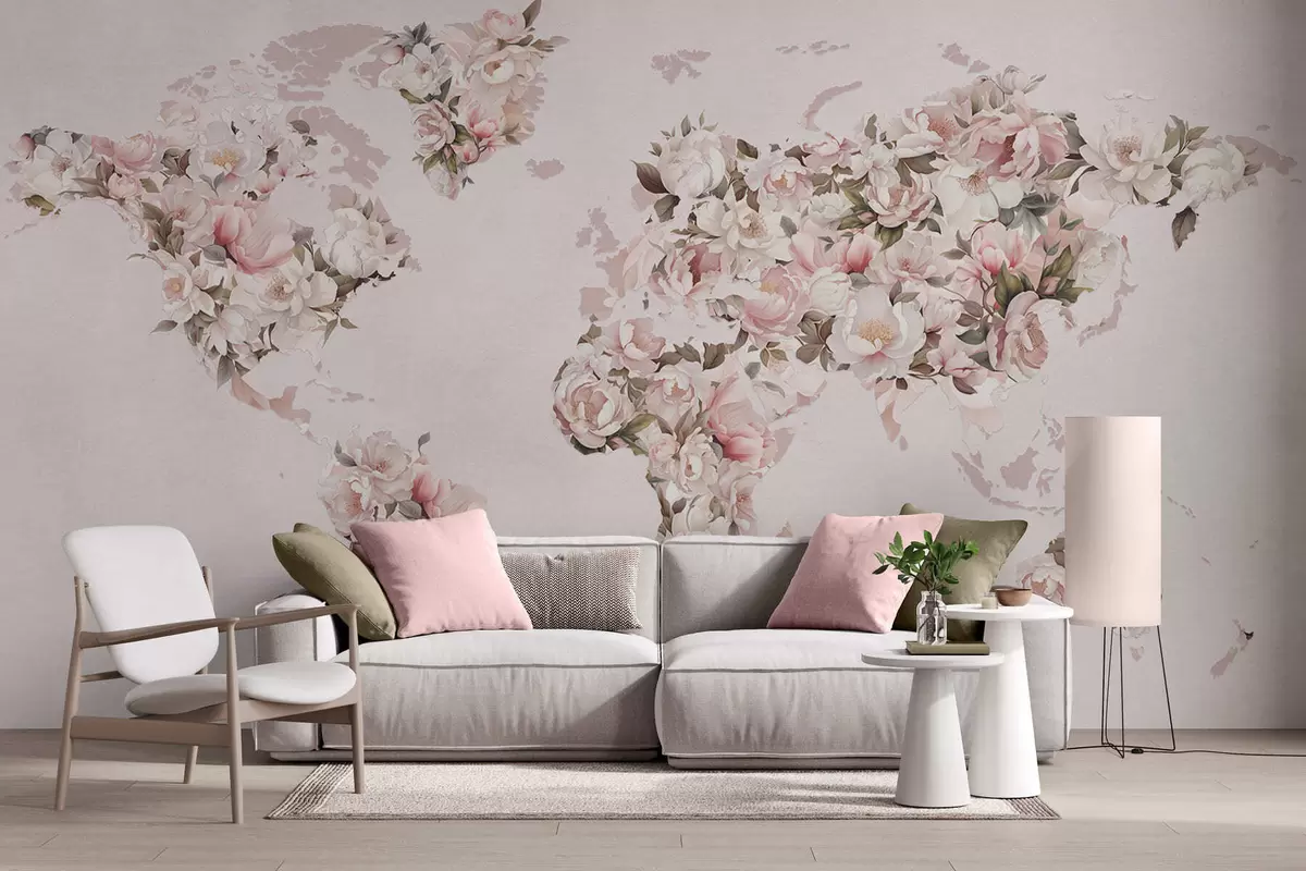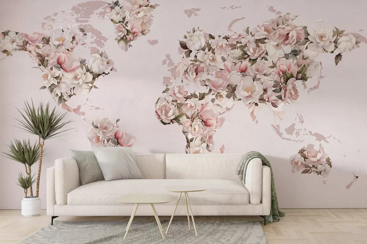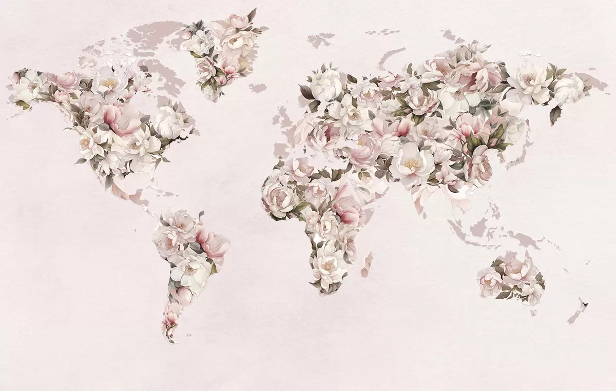 Murais de parede Um mapa-múndi rosa feito de grandes peônias brancas e rosa Nr. c00005