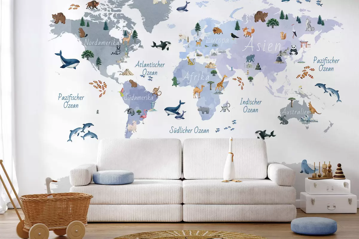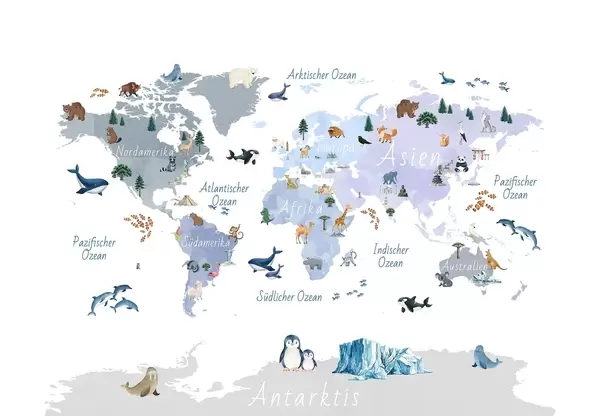 Murais de parede Um mapa azul em estilo aquarela, com animais, plantas e arquitetura. Legendas em alemão Nr. c00009dev1