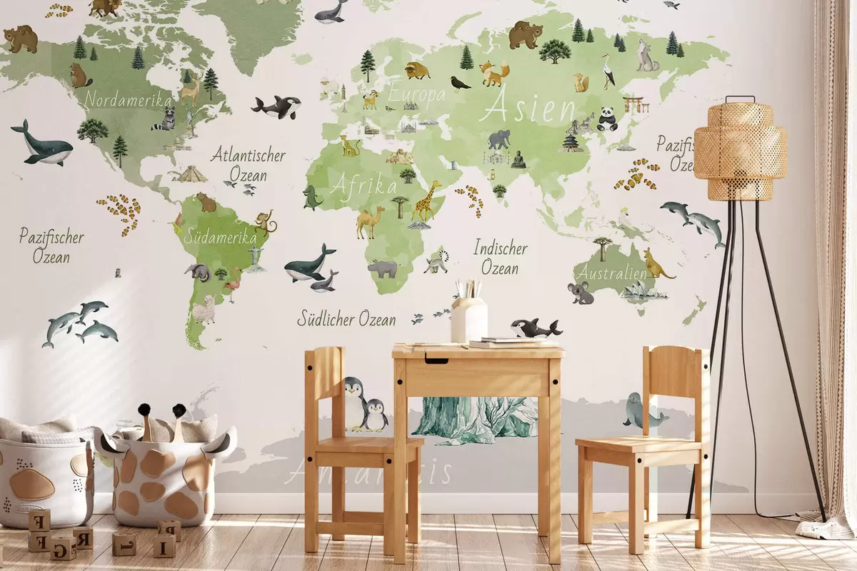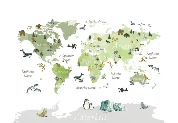 Murais de parede Um mapa verde em estilo aquarela, com animais, plantas e arquitetura. Legendas em alemão Nr. c00009dev2