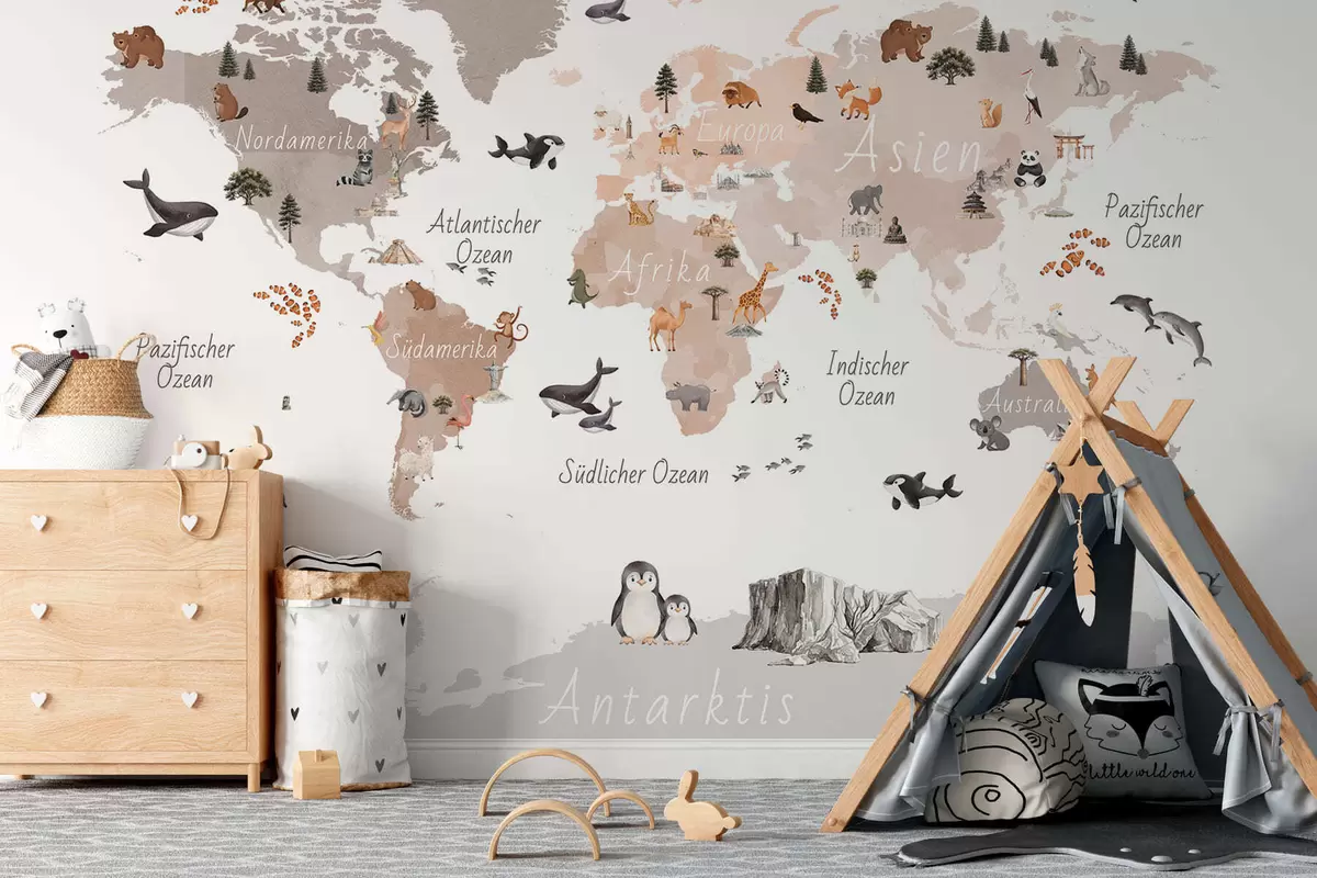 Murais de parede Um mapa em tons de bege, em estilo aquarela, com animais, plantas e arquitetura. Legendas em alemão Nr. c00009dev3