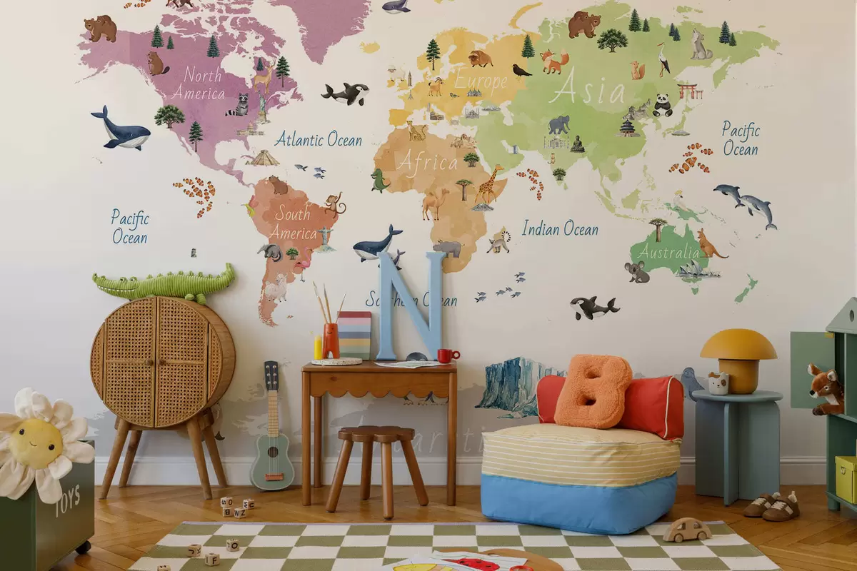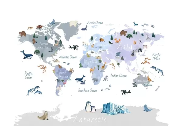 Murais de parede Um mapa colorido em estilo aquarela, apresentando animais, plantas e arquitetura. Legendas em inglês Nr. c00009en