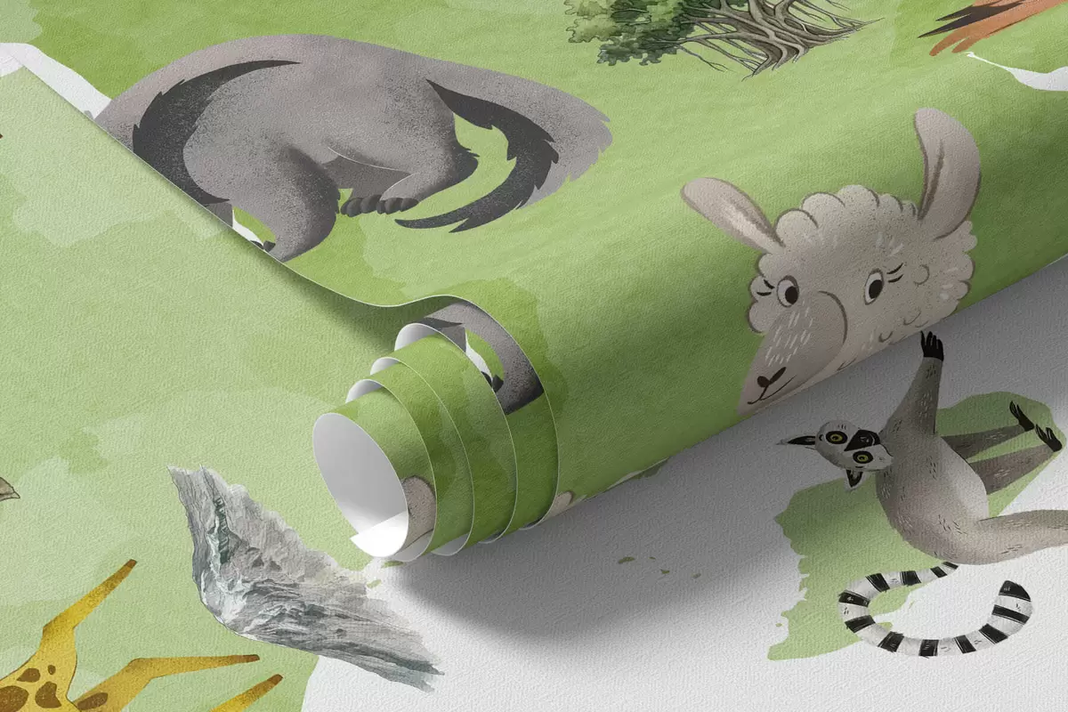 Murais de parede Um mapa verde em estilo aquarela, com animais, plantas e arquitetura. Legendas em inglês Nr. c00009env2