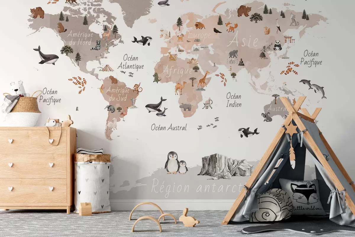 Murais de parede Um mapa em tons de bege, em estilo aquarela, com animais, plantas e arquitetura. Legendas em francês Nr. c00009frv3
