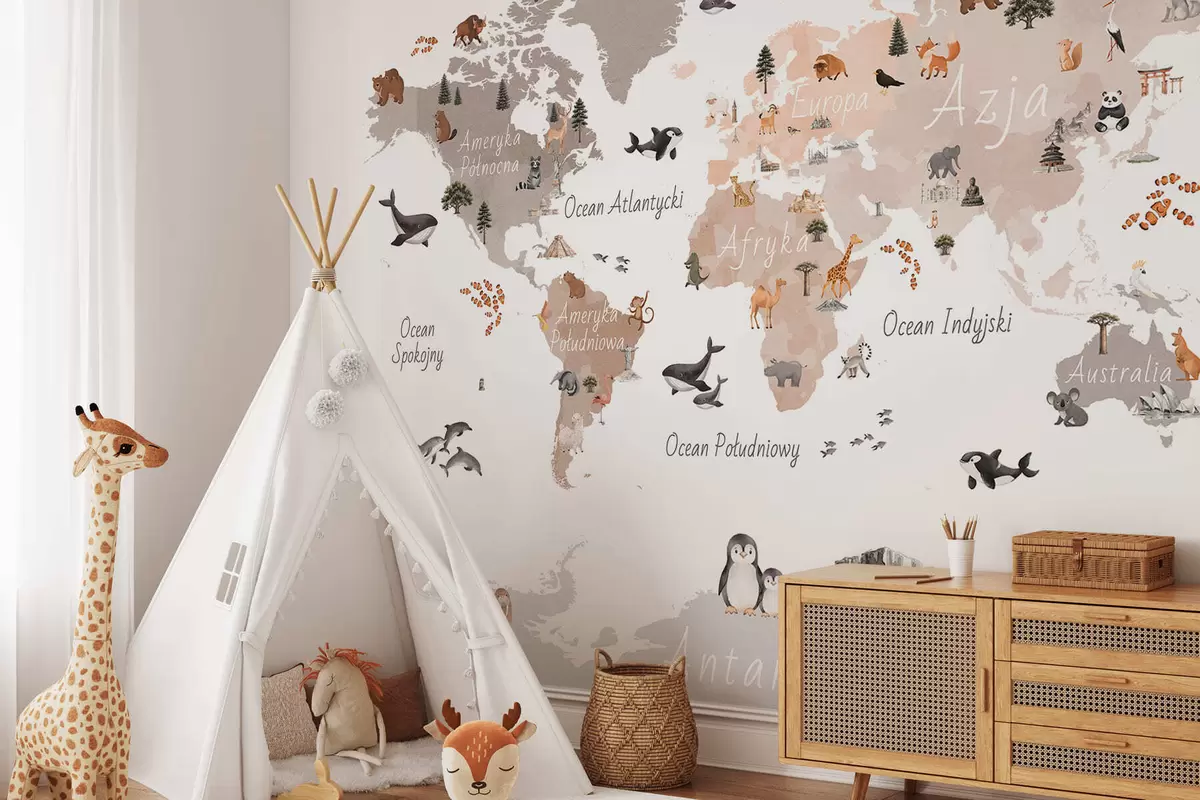 Murais de parede Um mapa em tons de bege, no estilo aquarela, com animais, plantas e arquitetura. Legendas em polonês Nr. c00009plv3