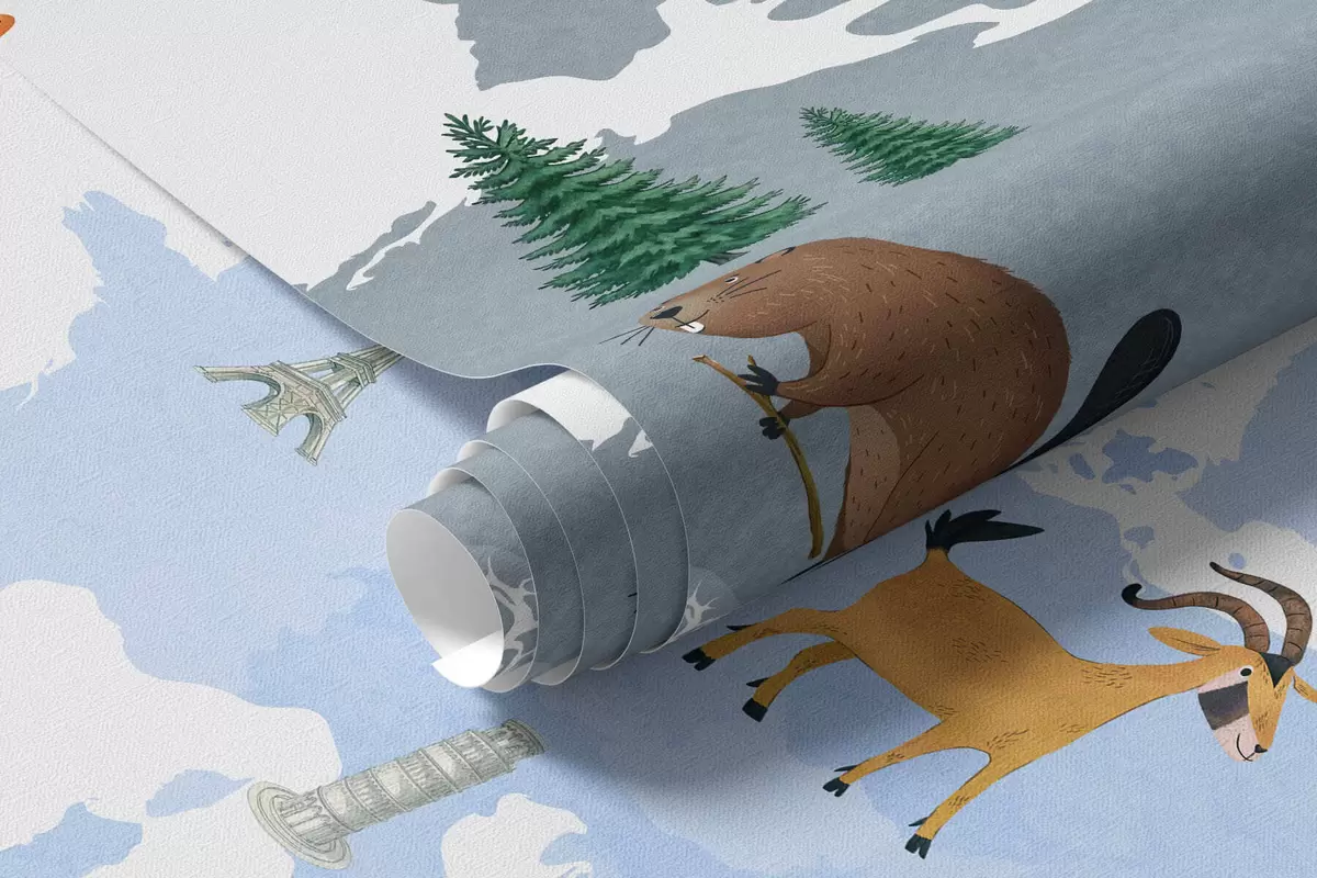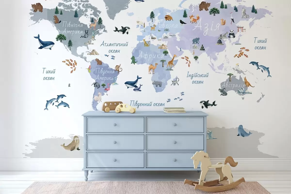 Murais de parede Um mapa azul em estilo aquarela, com animais, plantas e arquitetura. Legendas em ucraniano Nr. c00009ukv1