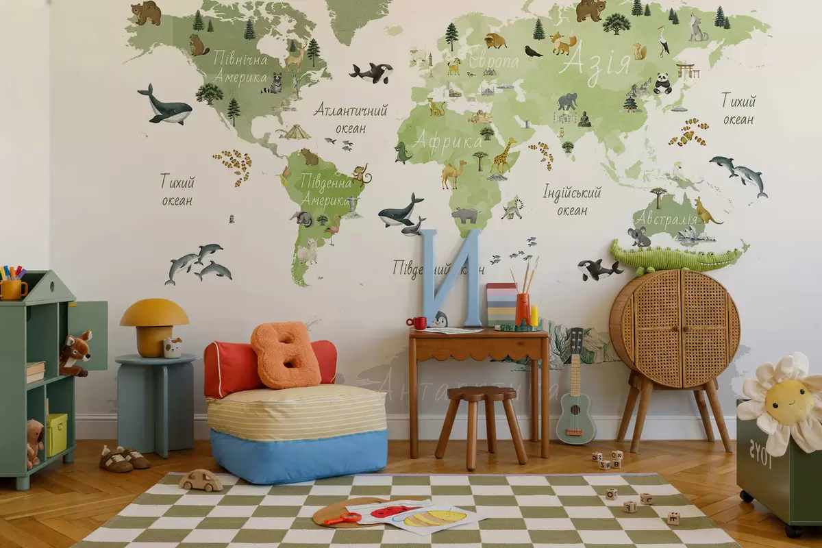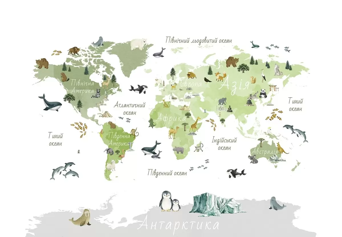 Murais de parede Um mapa verde em estilo aquarela, com animais, plantas e arquitetura. Legendas em ucraniano Nr. c00009ukv2