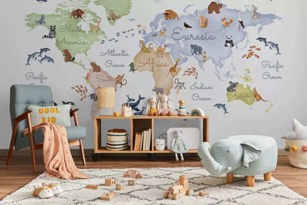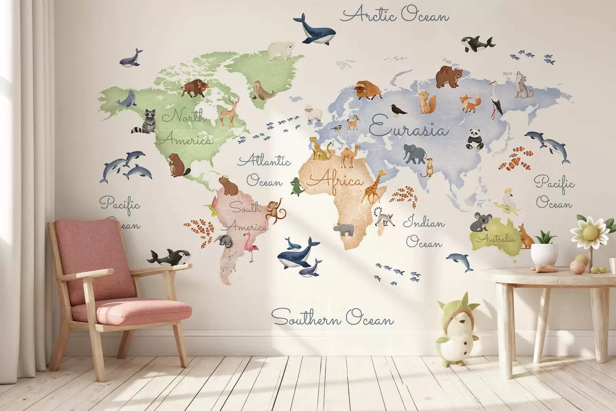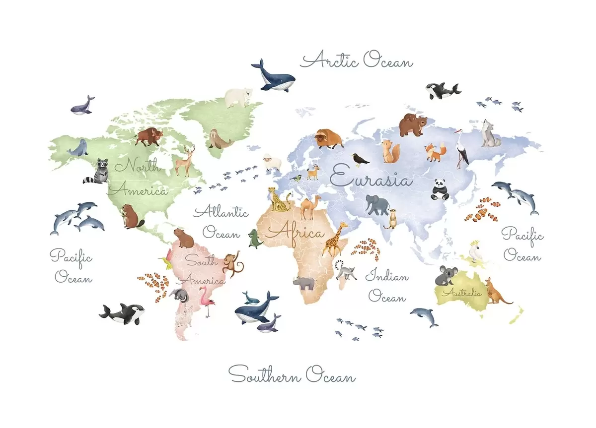 Murais de parede Um mapa colorido em estilo aquarela com animais. Legendas em inglês Nr. c00012en