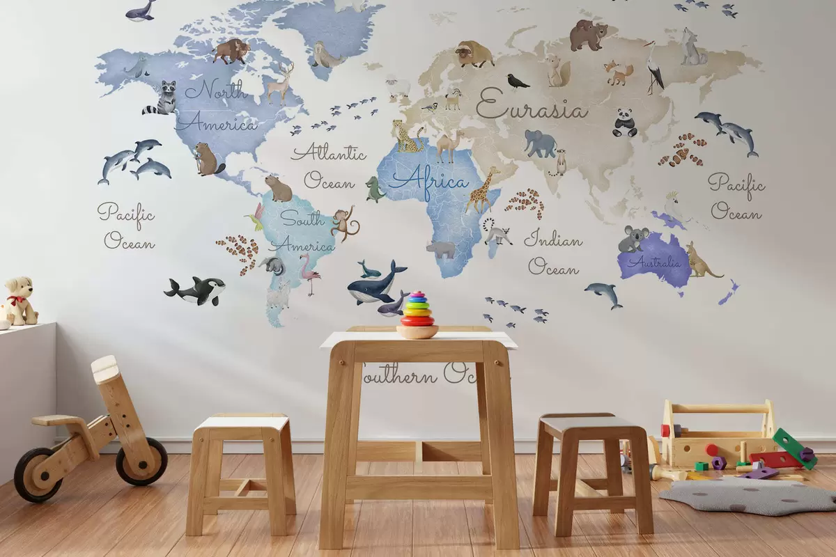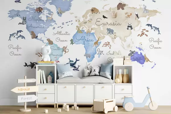 Murais de parede Um mapa azul em estilo aquarela com animais. Legendas em inglês Nr. c00012env1
