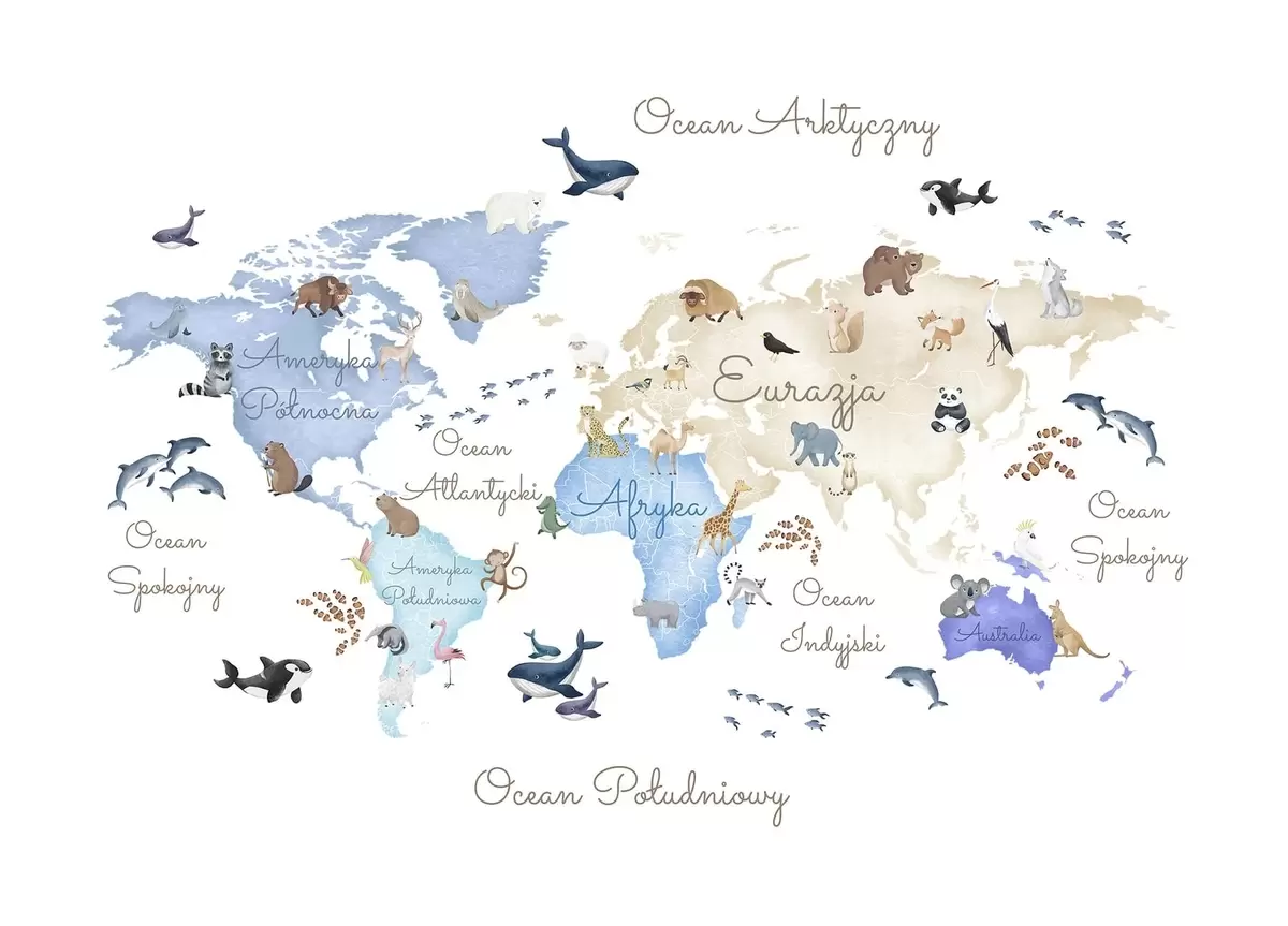 Murais de parede Um mapa azul em estilo aquarela com animais. Legendas em polonês Nr. c00012plv1