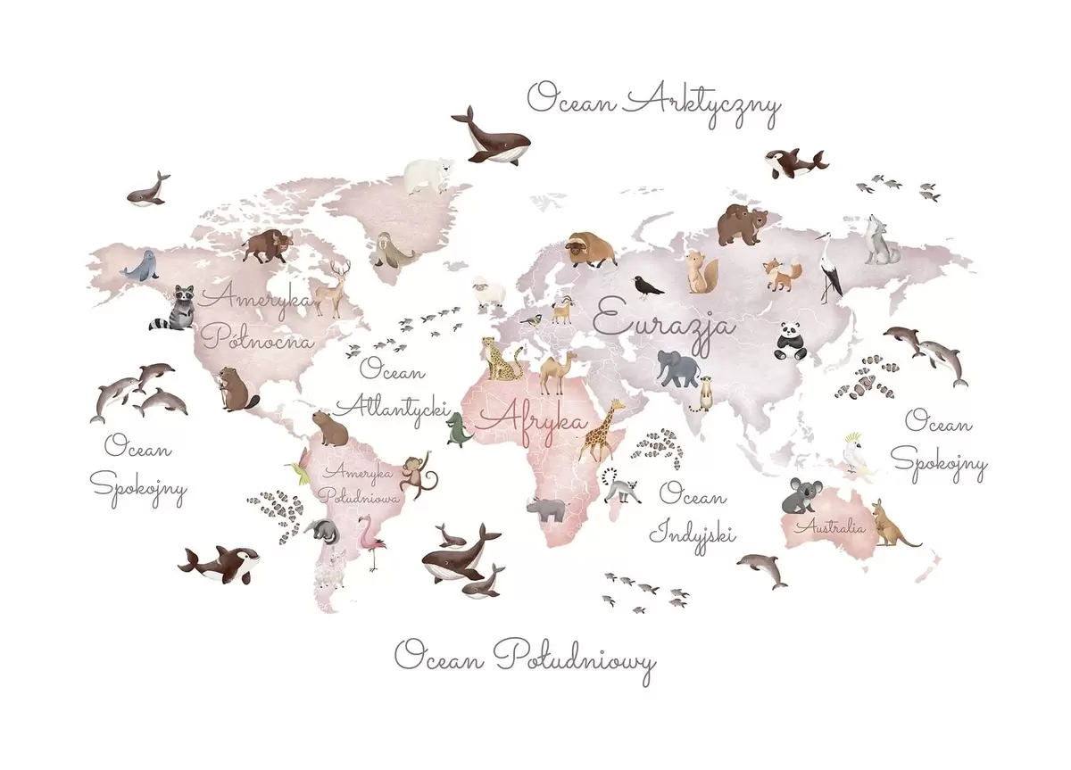 Murais de parede Um mapa em tons de bege, com estilo de aquarela, que apresenta animais. Legendas em polonês Nr. c00012plv3
