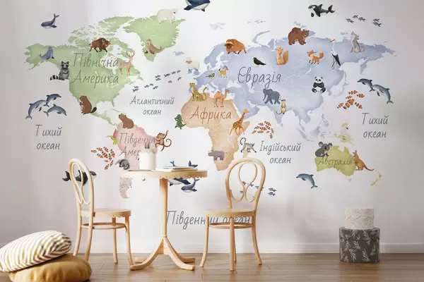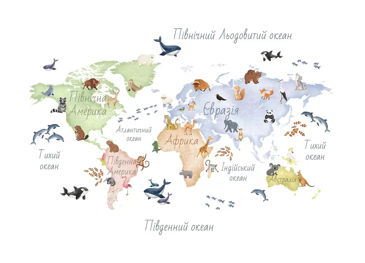Murais de parede Um mapa colorido em estilo aquarela com animais. Legendas em ucraniano Nr. c00012uk