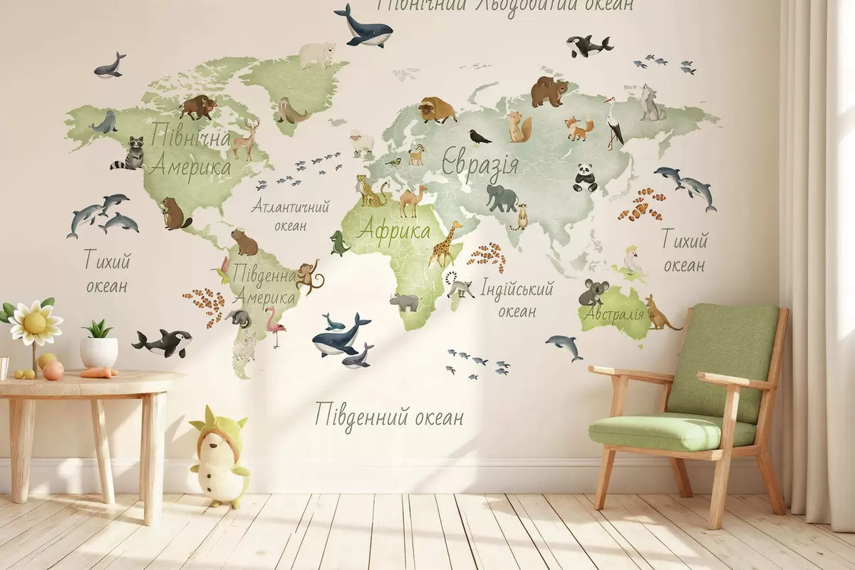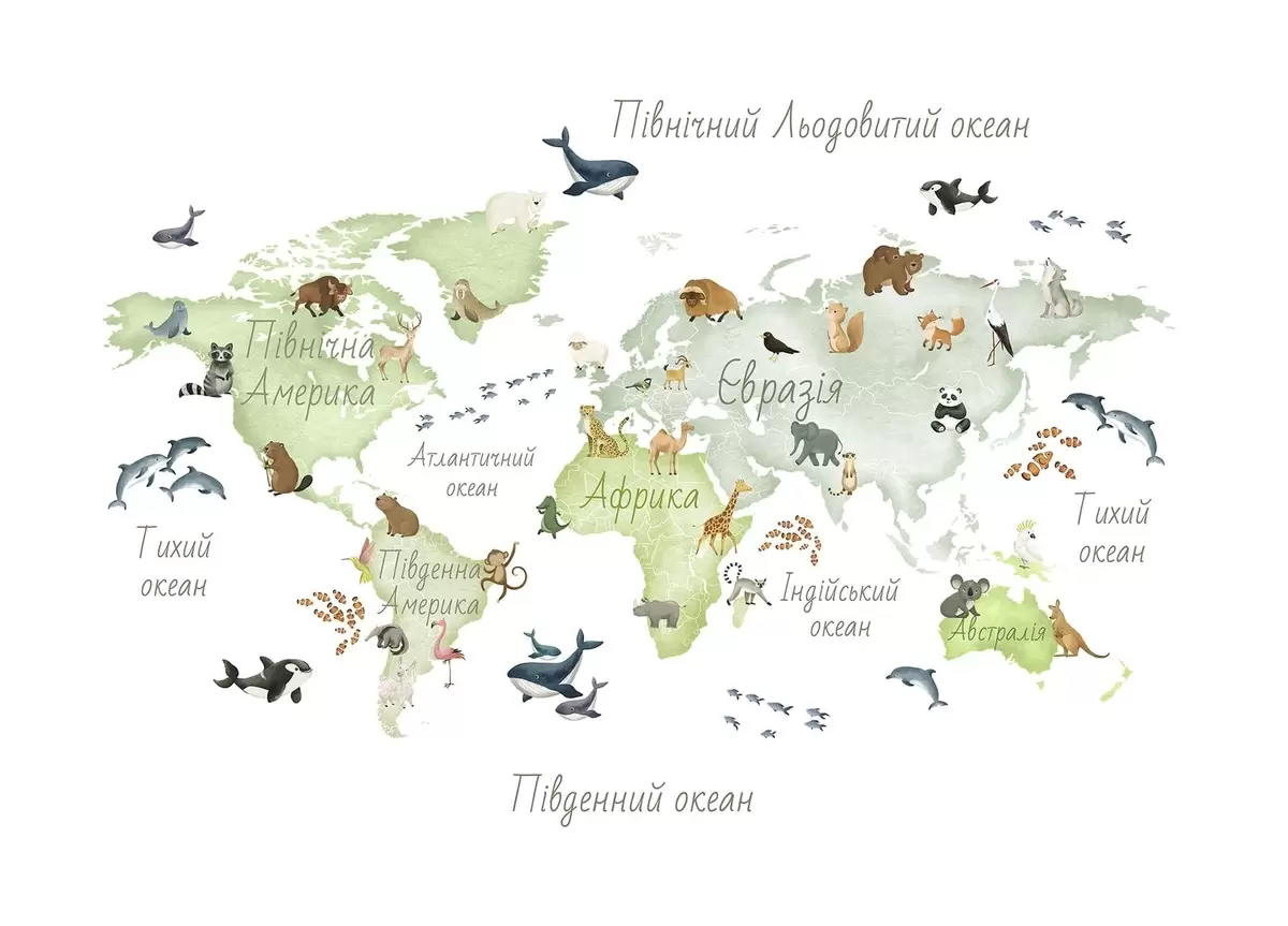 Murais de parede Um mapa verde em estilo aquarela com animais. Legendas em ucraniano Nr. c00012ukv2