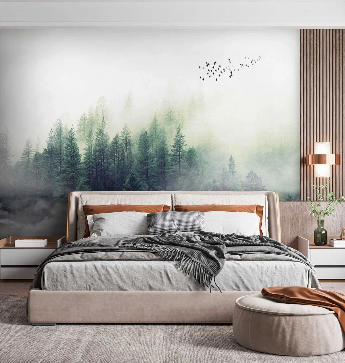 Murais de parede Floresta e pássaros na névoa Nr. u10882