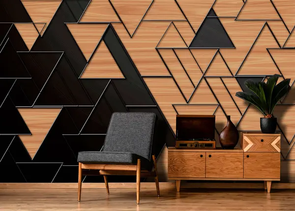 Murais de parede triângulos 3D em cinzento escuro e grão de madeira com linhas em relevo Nr. u75167