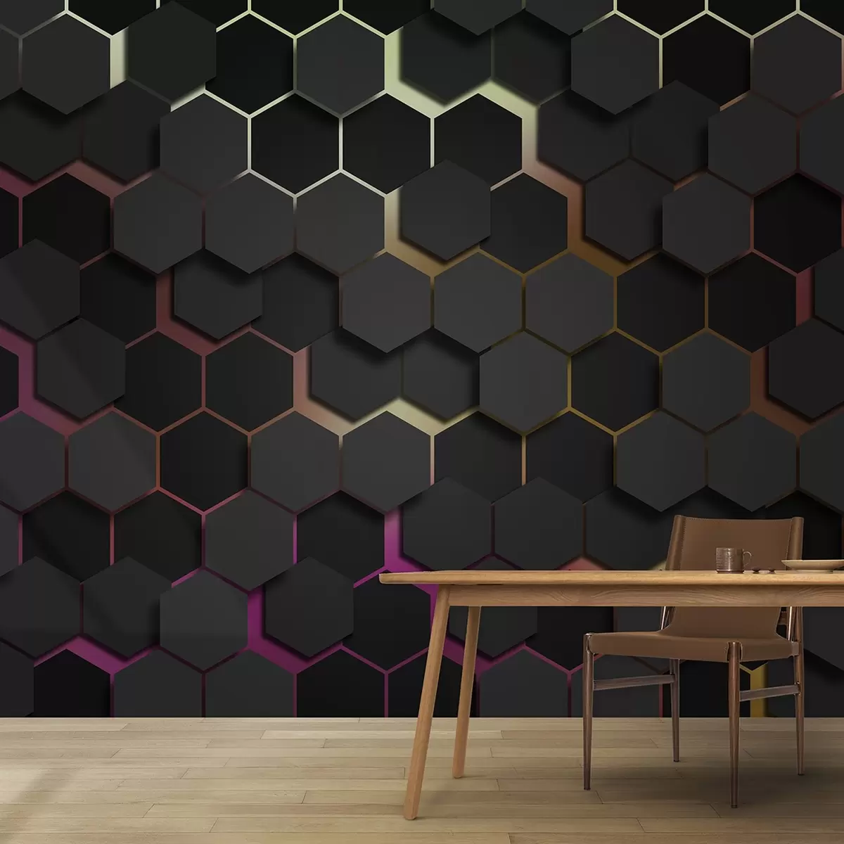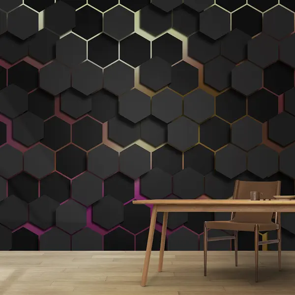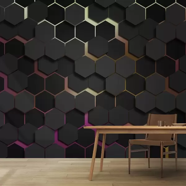 Murais de parede Hexágonos pretos com efeito 3d em preto e cor-de-rosa Nr. u79935v3