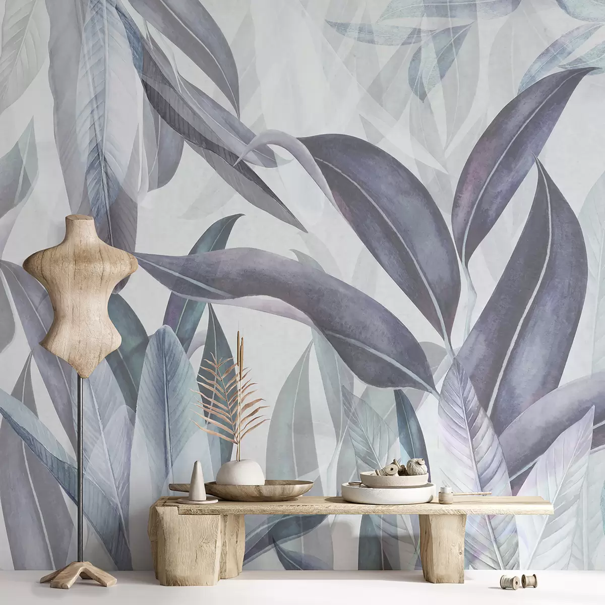 Murais de parede Folhas de palmeira verdes e cor-de-rosa em tons de azul Nr. u94302v1