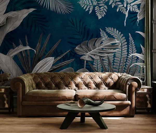 Murais de parede Folhas tropicais em fundo azul no estilo grunge Nr. u94419