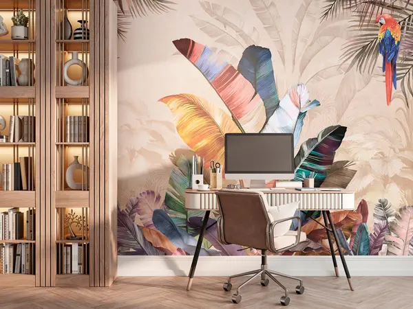 Murais de parede Folhas de palmeira coloridas com pássaro papagaio tropical Nr. u95050