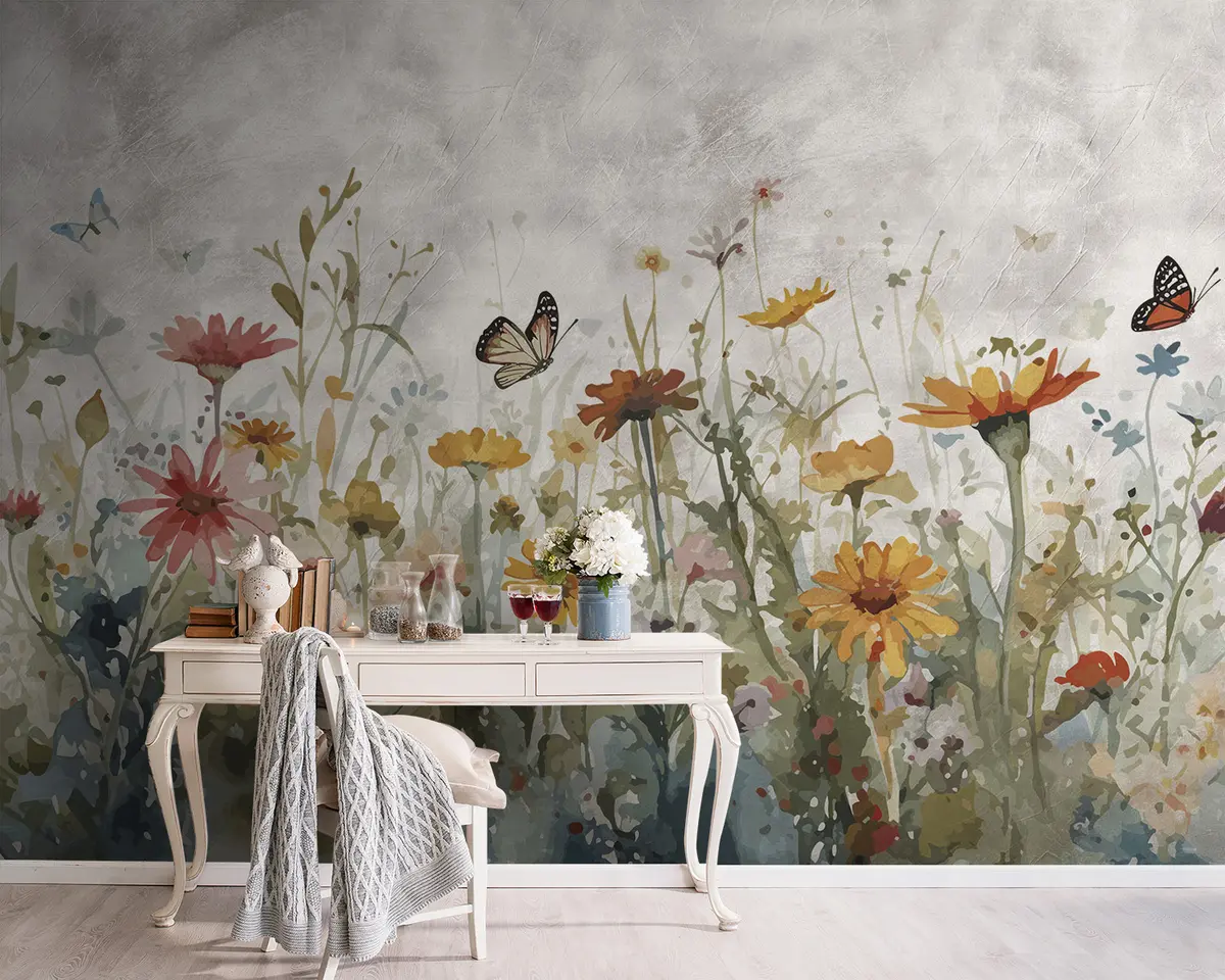 Murais de parede Aquarela flores silvestres e borboletas Nr. u95406