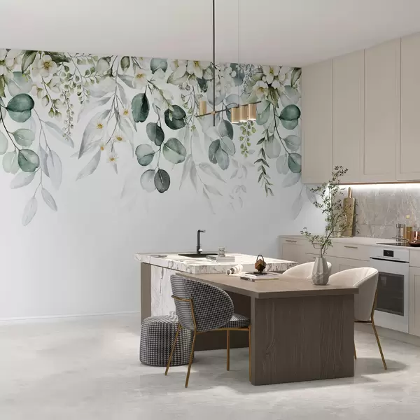 Murais de parede Ilustração com folhas verdes, flores brancas, peónia e ramos Nr. u96063
