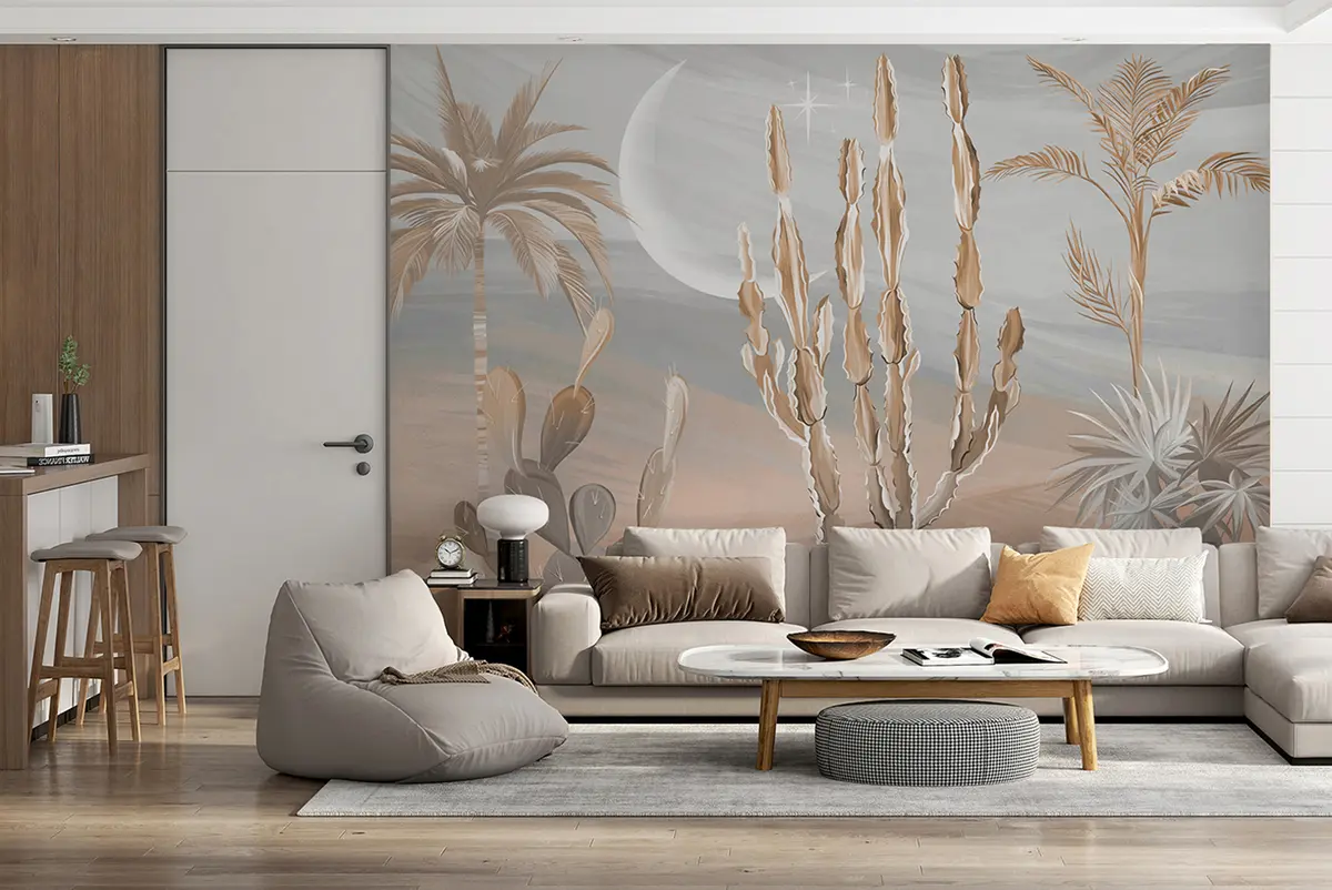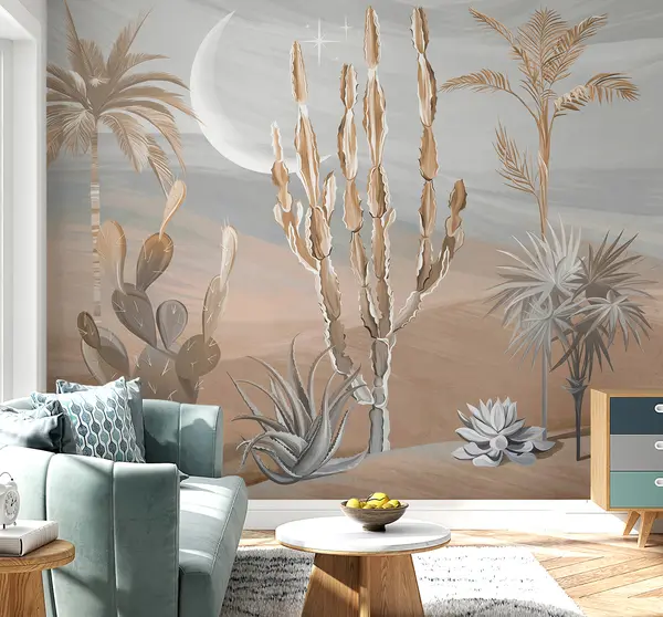 Murais de parede Deserto 3D com cactos e folhas tropicais Nr. u96444