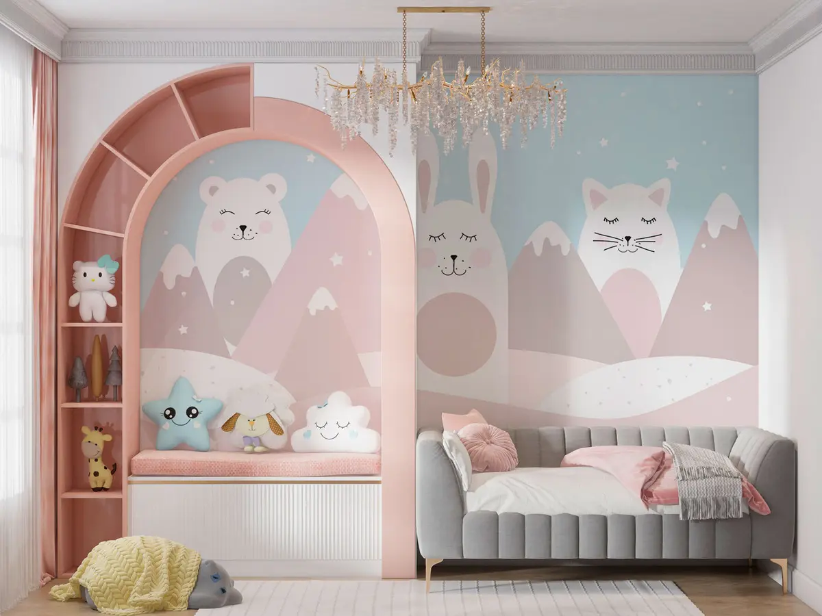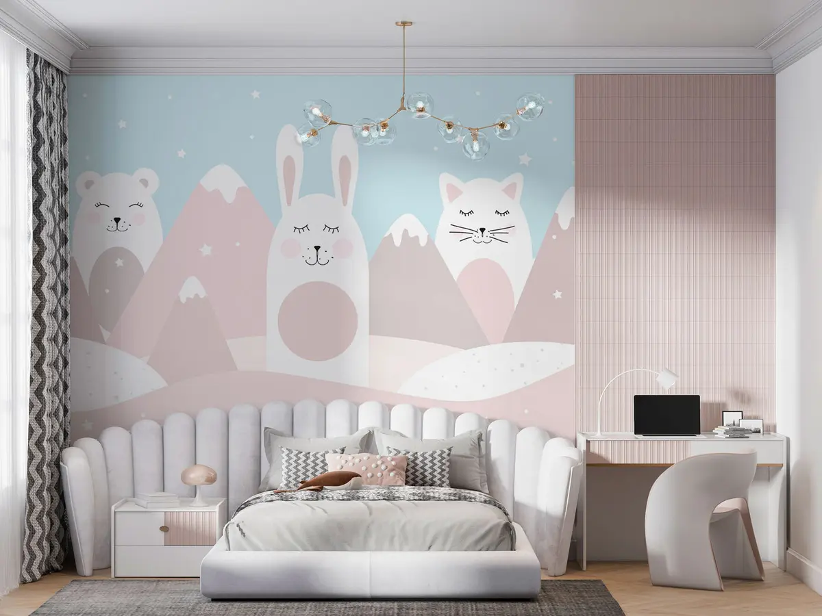 Murais de parede Coelho, urso, raposa num fundo de montanhas bege cobertas de neve Nr. u98135