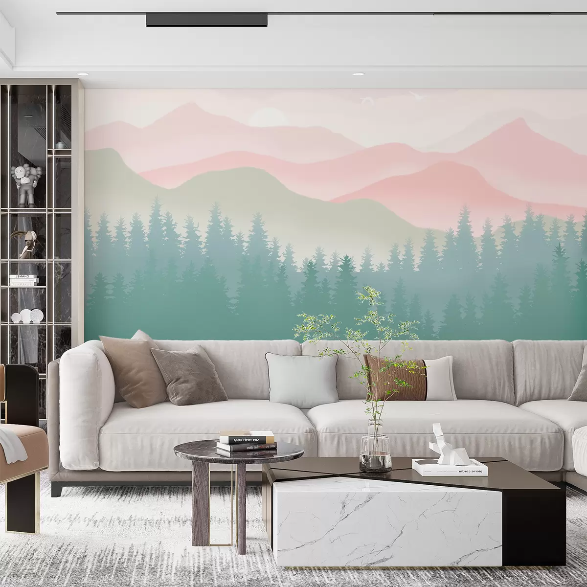 Murais de parede Montanhas enevoadas com floresta de pinheiros, cores naturais suaves, rosa e verde Nr. u98774