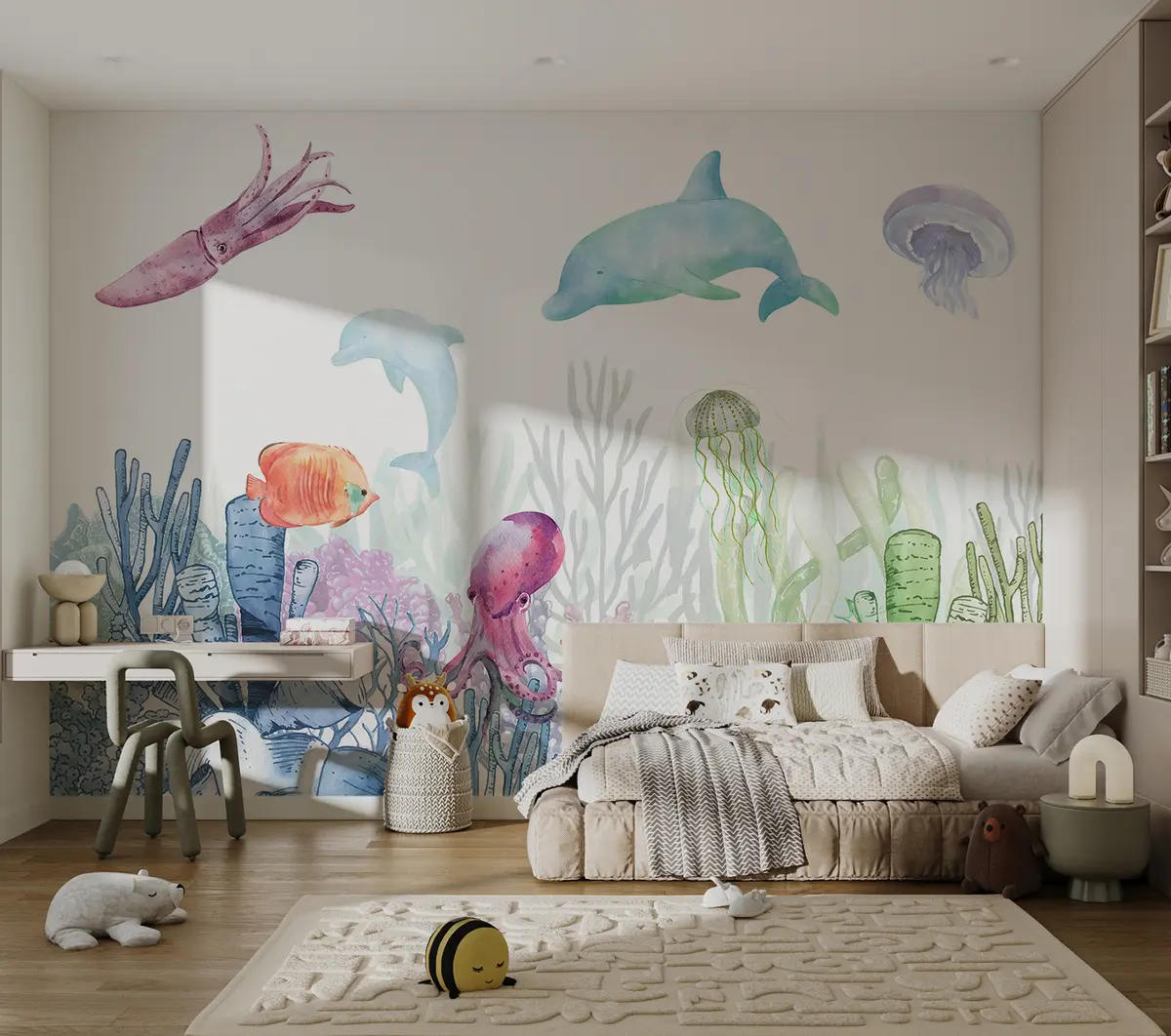 Murais de parede Vida marinha subaquática, Animais marinhos, Aguarela, Corais, Golfinho, Polvo Nr. u98899