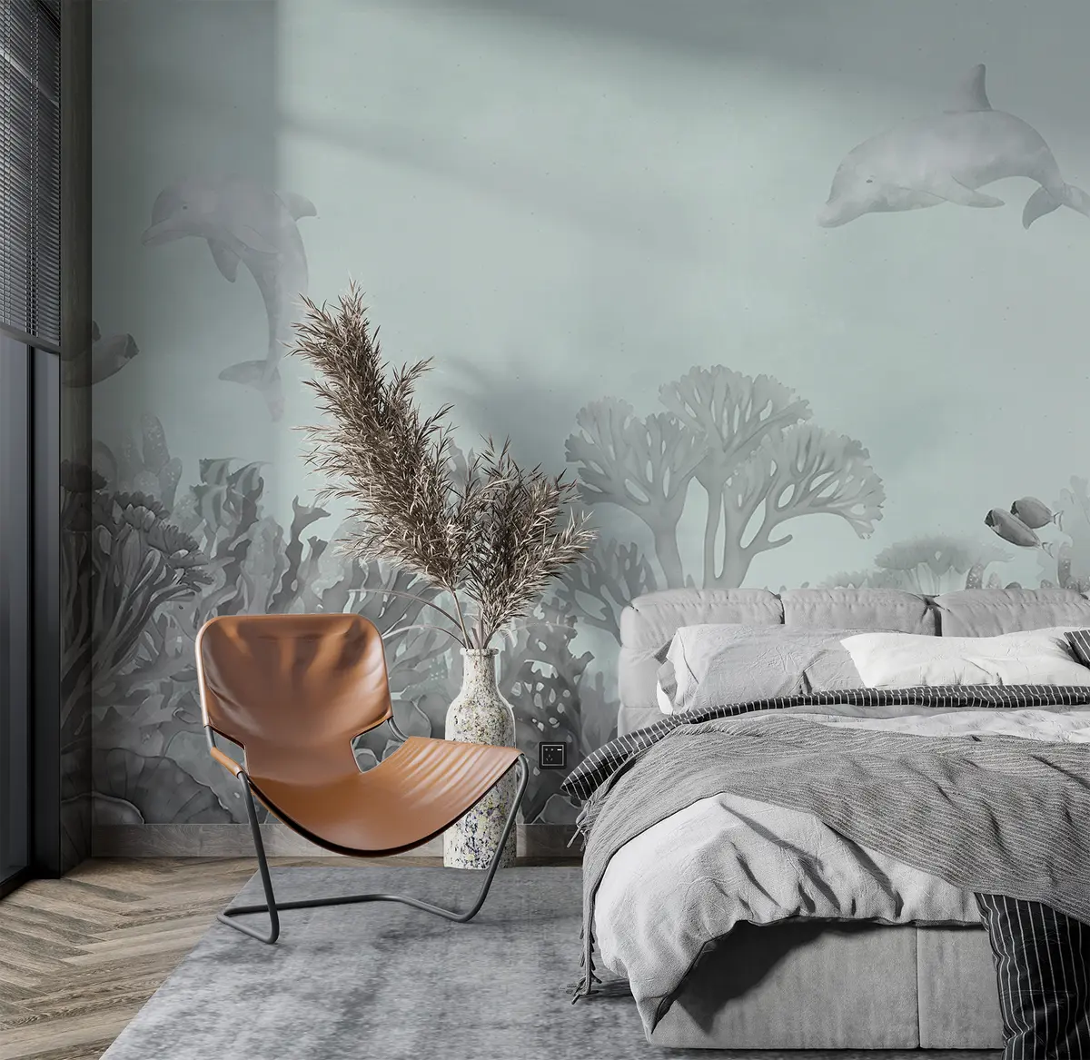 Murais de parede Vida marinha subaquática, recife de coral, aguarela cinzenta e azul, golfinhos Nr. u98900