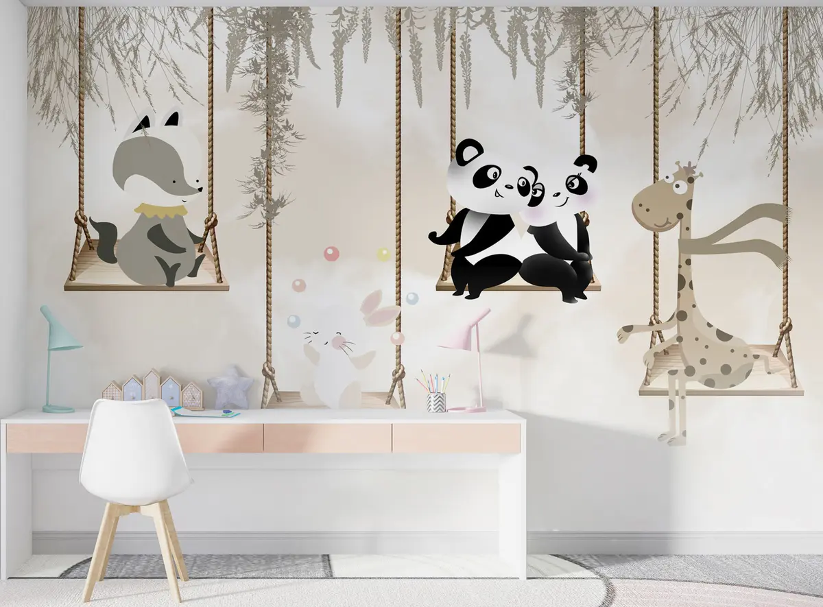 Murais de parede Design de papel de parede para quarto de criança com girafa, guaxinim, lebre e pandas nos baloiços Nr. u98972
