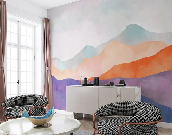 Murais de parede Paisagem montanhosa, desenho abstrato, estilo boho, laranja, púrpura, azul Nr. u98991