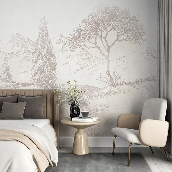 Murais de parede Paisagem da Toscana, árvore, campo, minimalismo, cores bege naturais Nr. u99570