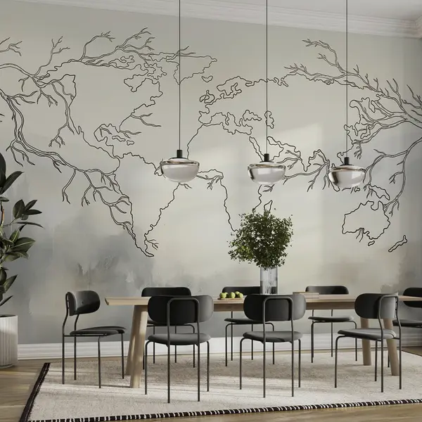 Murais de parede Mapa-mundo, ramos de árvores, desenho de linhas, minimalismo, fundo com textura bege Nr. u99737