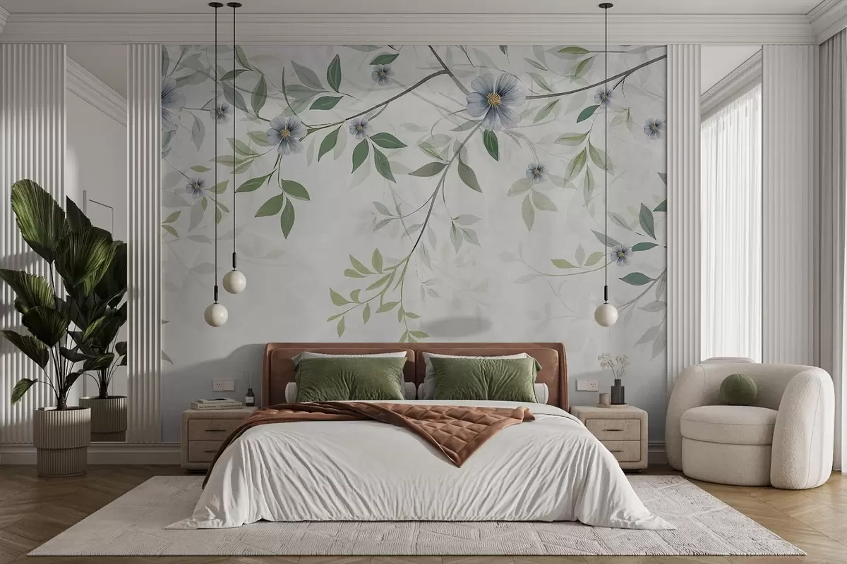 Murais de parede Galhos com folhas verdes e flores azuis Nr. w00316