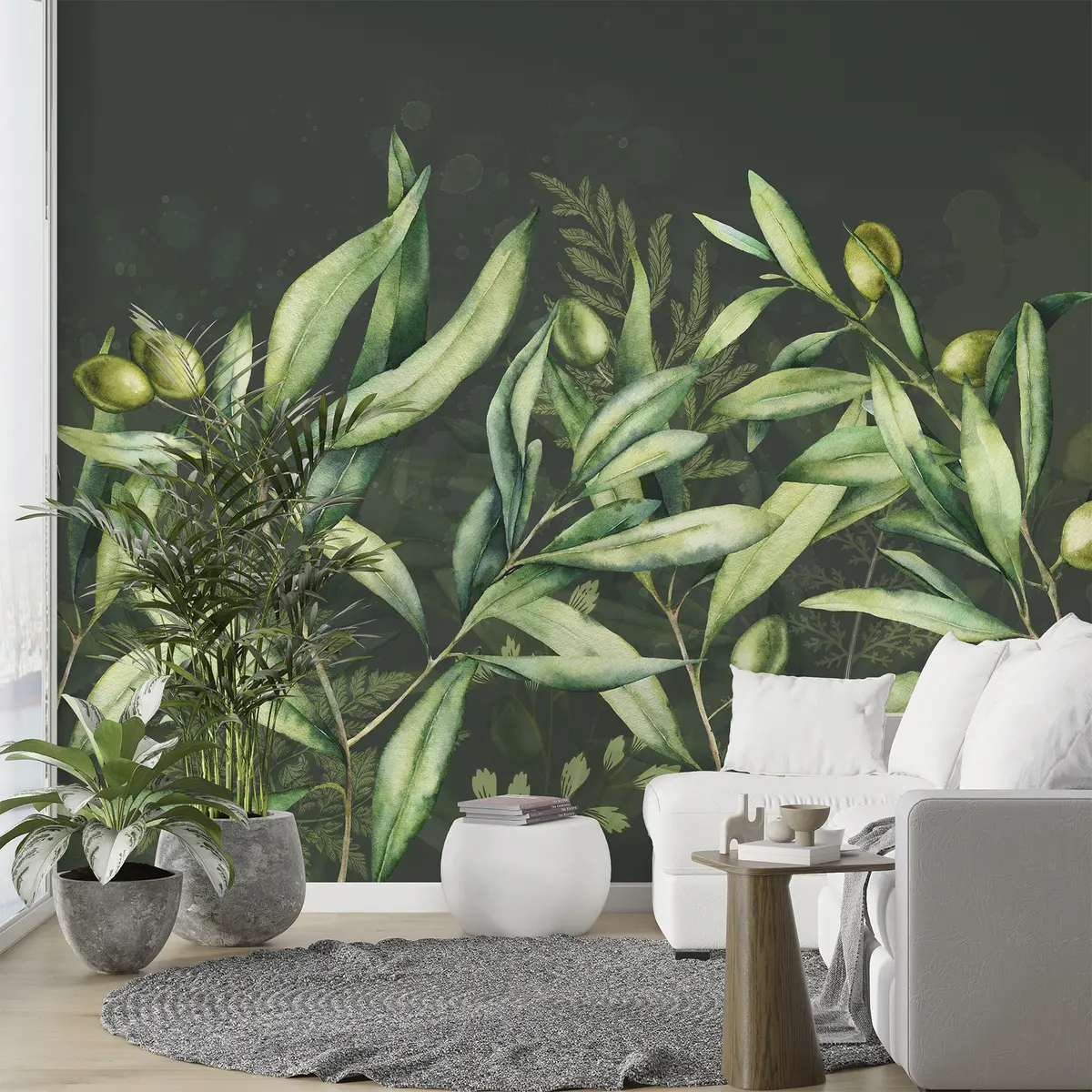 Murais de parede Ilustração de azeitonas, design floral, tropical, aquarela, folhas grandes, fundo escuro Nr. w00407v4