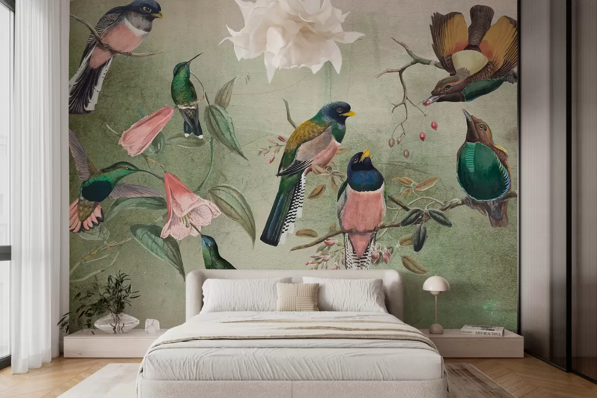 Murais de parede Um grupo de pássaros coloridos empoleirados em galhos no plano de fundo texturizado Nr. w00543